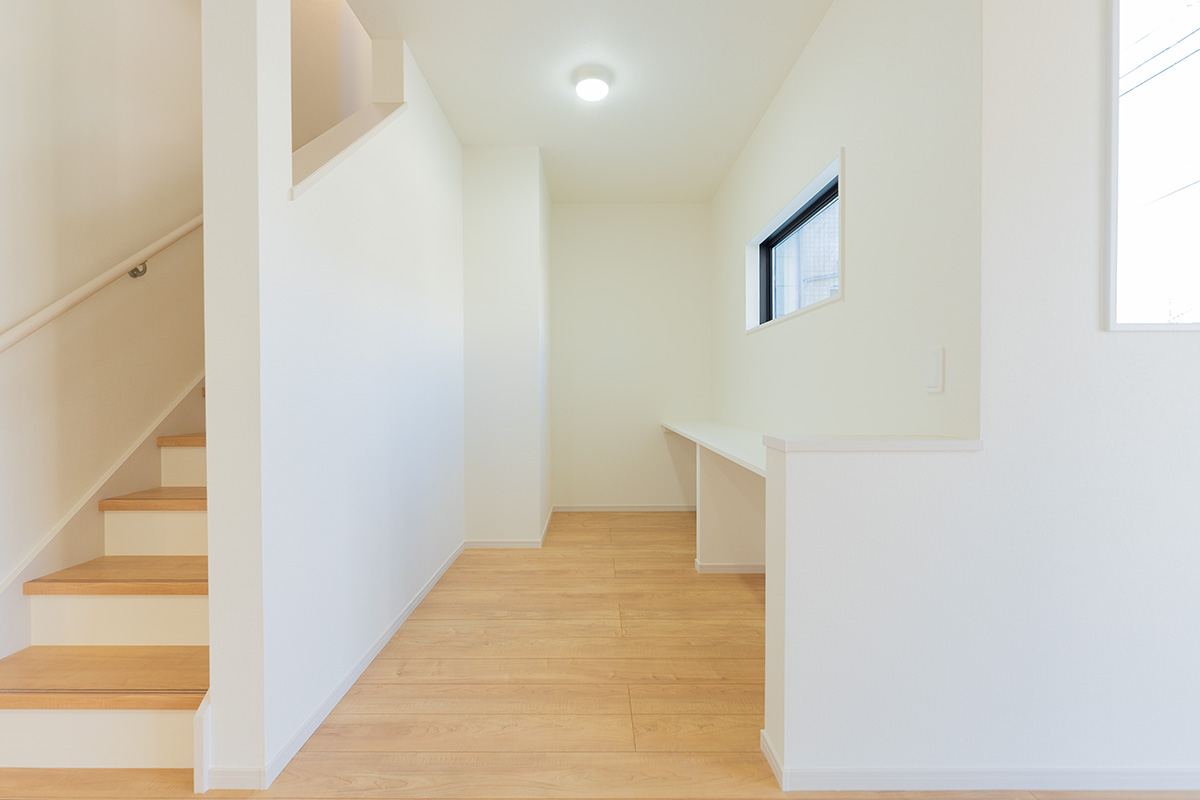 1階に設けられた2.8帖のフリースペースには、空間にぴったりとフィットする造作カウンターを標準装備。入居したその日から、快適なテレワークルームや、お子様のリビング学習スペースとして活躍します。