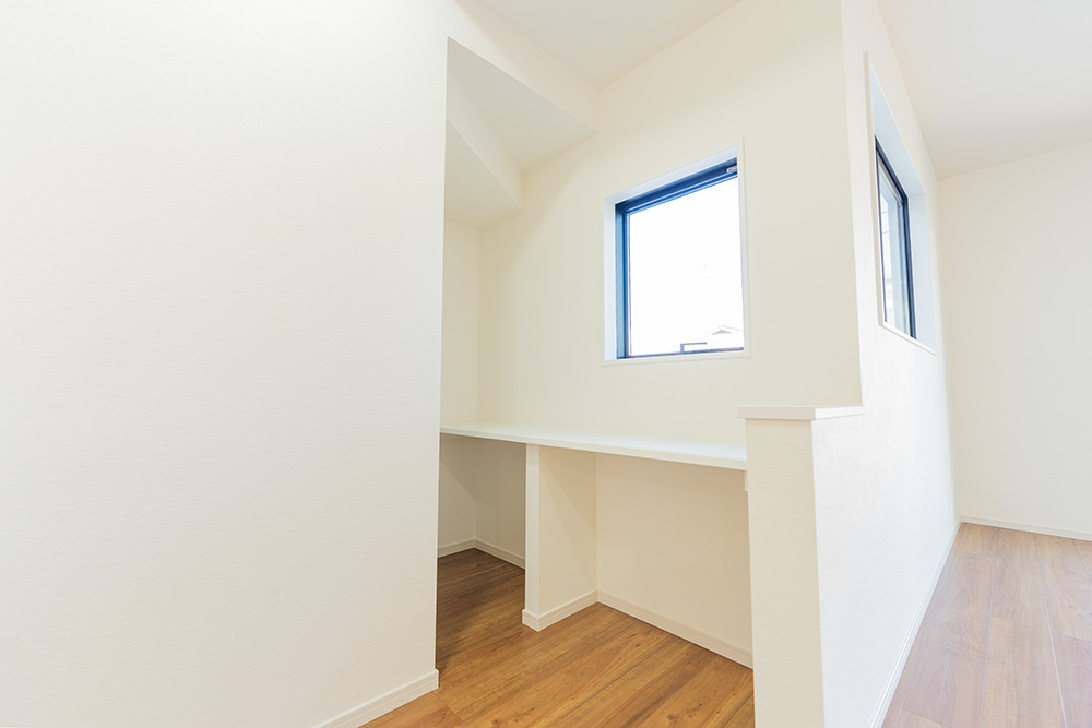 リビングの片隅、階段下の空間にひっそりと佇む2帖のフリースペース。不思議と心落ち着く「自分だけの場所」になります。備え付けの型造作カウンターは、テレワークの書斎として、お子様のリビング学習机として、あるいは家事の合間の読書スペースとして即座に活躍。