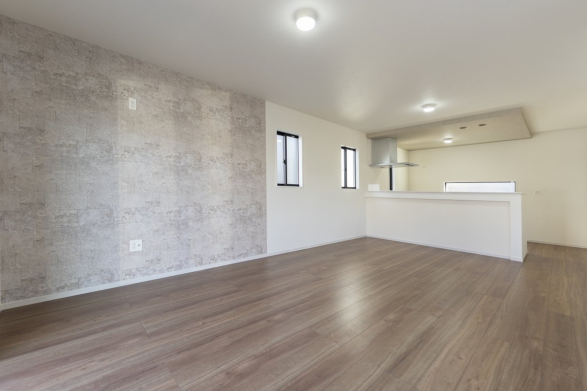 リビングの壁には品格漂う石目調のアクセントウォール。無機質で洗練されたグレーの壁面が、足元の温かな木目調フロアと絶妙に調和し、まるで高級ホテルのラウンジのような静けさを生み出します。
