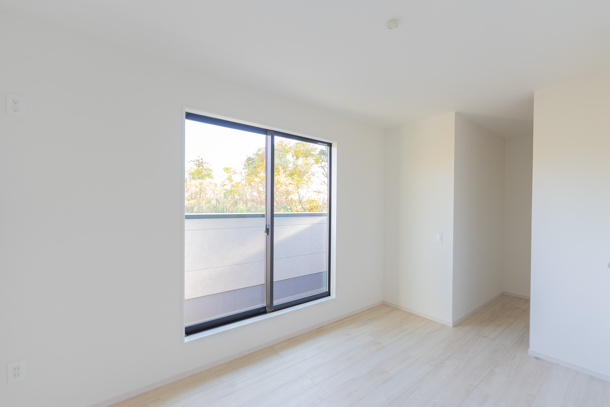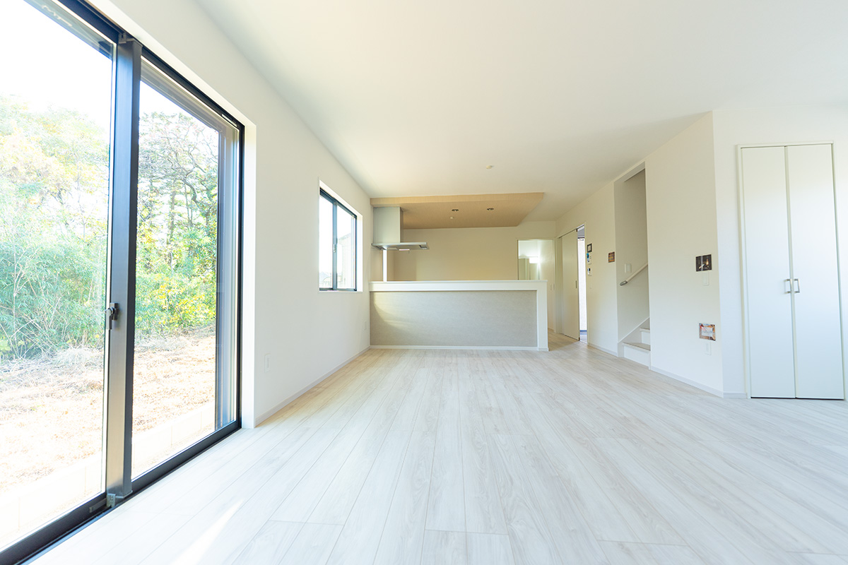 左側の大きな窓から木々が見えるのが、この家の一番の贅沢かもしれません。分譲地だと「窓を開けたらお隣さんの壁だった」ということも多いですが、ここは外の視線を気にせず自然の光をたっぷり入れられます。床の色も明るいので、日中は照明なしでもかなり明るく過ごせるはずです。