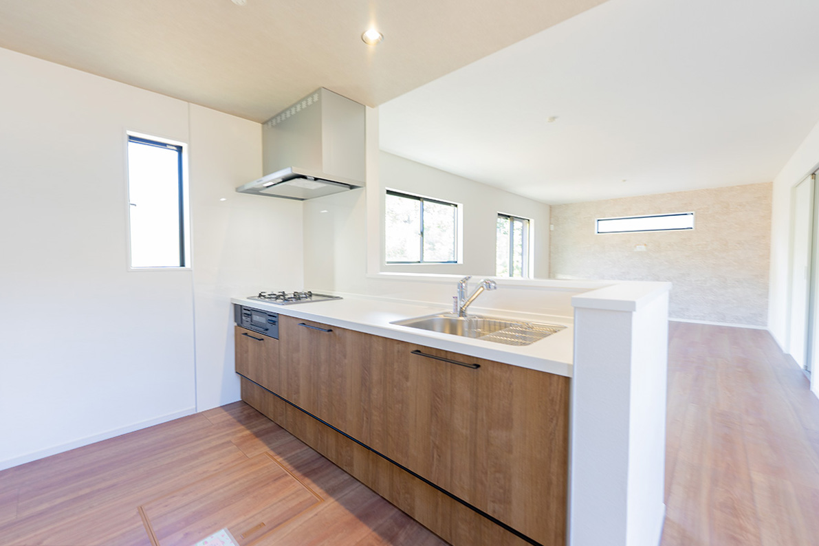 広々としたリビングを見渡せる対面式キッチンは、床材と美しく調和する木目調デザイン。空間にすっと馴染み、まるで上質な家具のような佇まいです