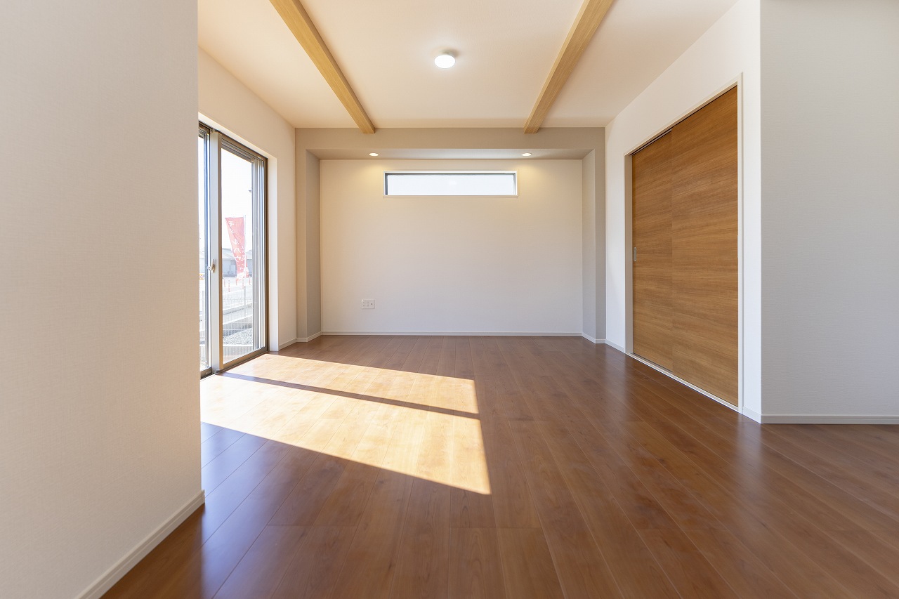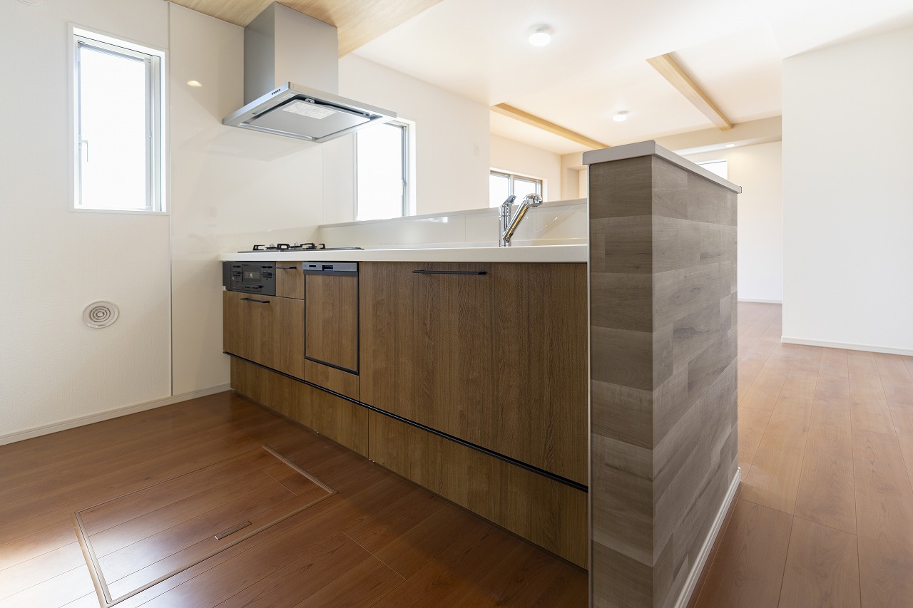 キッチンの天井には木目のアクセントを施して落ち着きを演出し、リビング側には現し梁を通して開放感をプラス。 この「高さ」と「素材」の変化が、壁を作らずに食事エリアとリラックスエリアを緩やかにゾーニングします。キッチンに立つ人とソファに座る人の目線が交わり、会話が弾む。機能美とデザイン性が融合した、自慢したくなるリビングです。