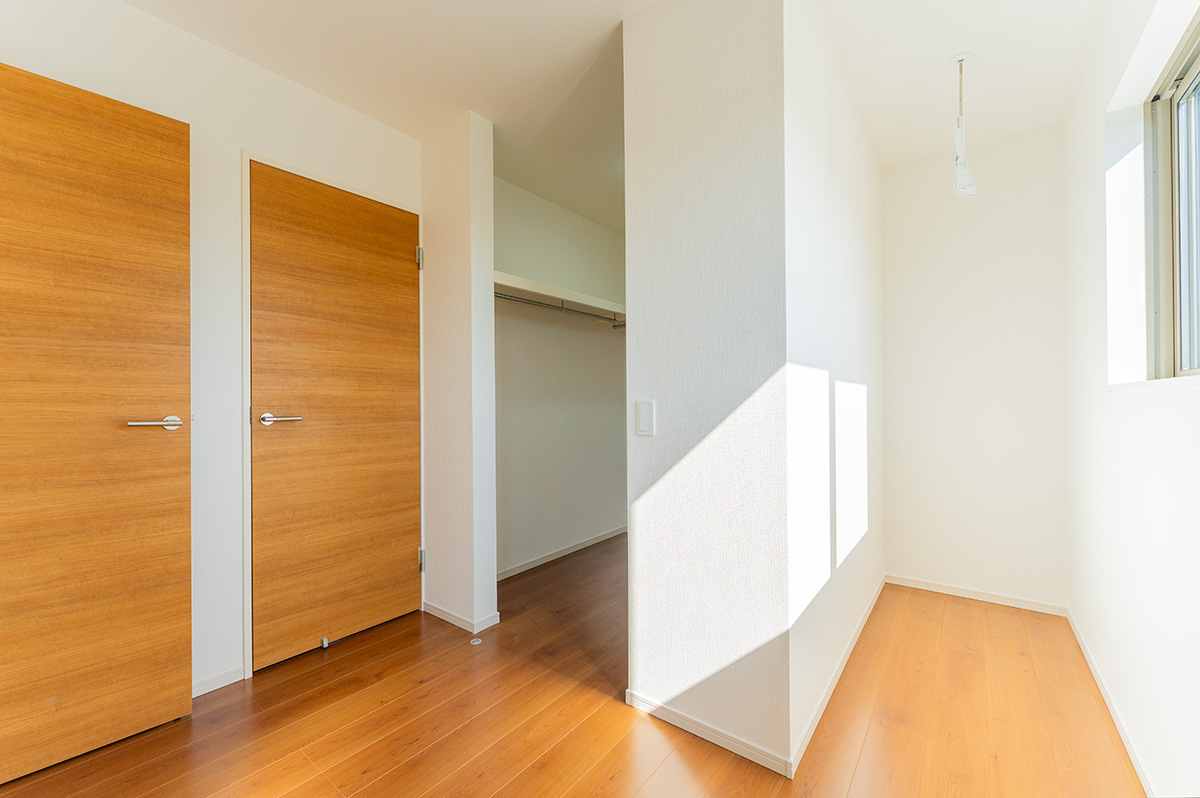 2階の南側に設けられた「サンルーム兼ファミリークローク」。ここは、日差しがたっぷりと降り注ぐ物干し場であり、家族全員の衣類基地でもあります。 バルコニーで乾いた洗濯物を、取り込んでそのままハンガーへ。雨の日はそのまま室内干し室として。取り込んだ服を各部屋に運ぶ必要はありません。