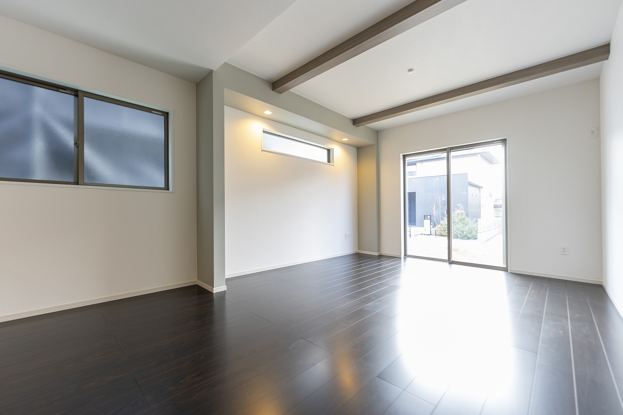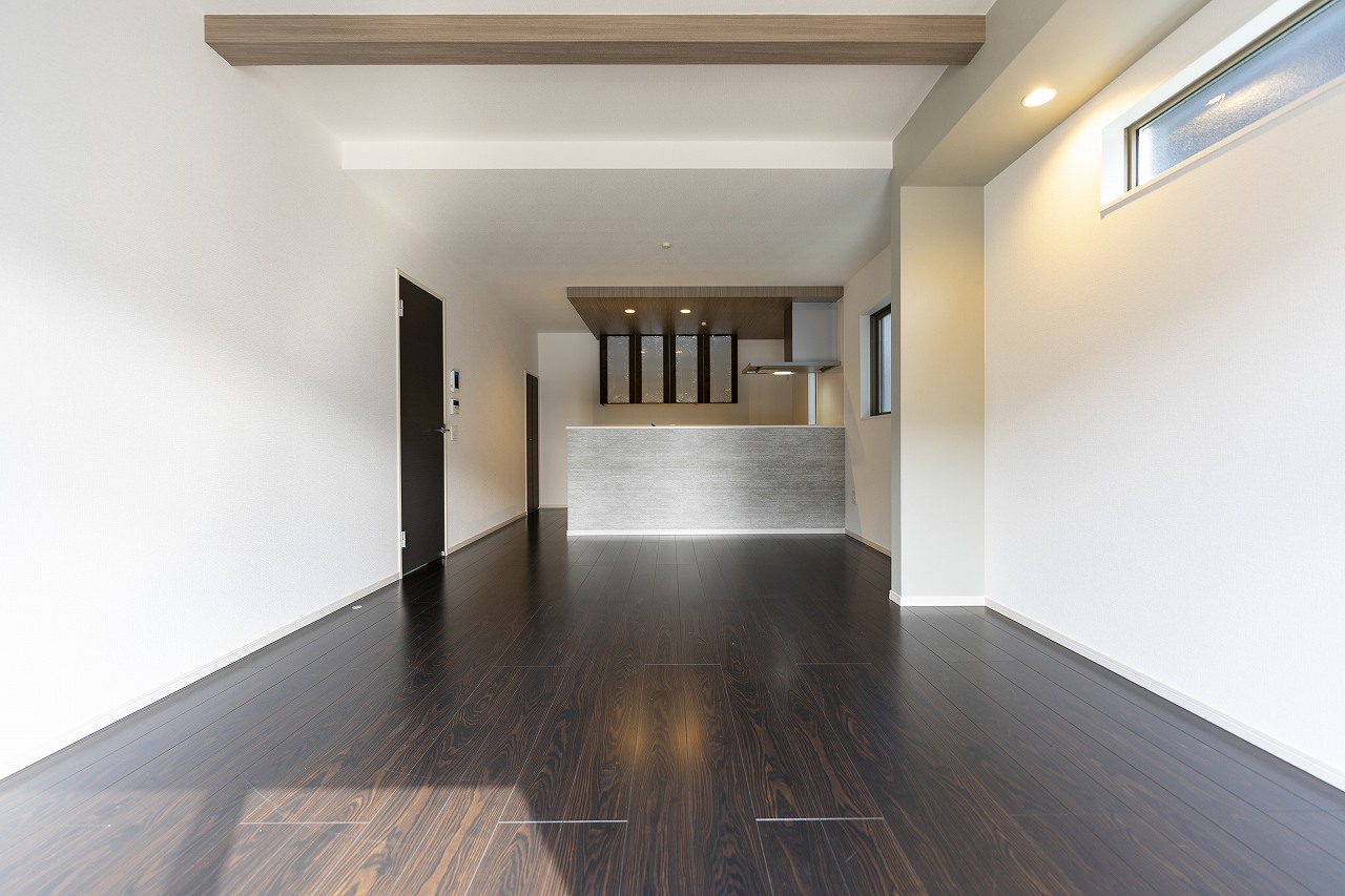 重厚感のあるダークウッドの床材が、空間全体に落ち着きと高級感を与えます。天井には木の温もりを感じるアクセント梁を配置し、視覚的なリズムを演出。夜はダウンライトの柔らかな光の下、お気に入りのソファで映画やお酒を楽しむ…そんな贅沢な時間が似合う空間です。