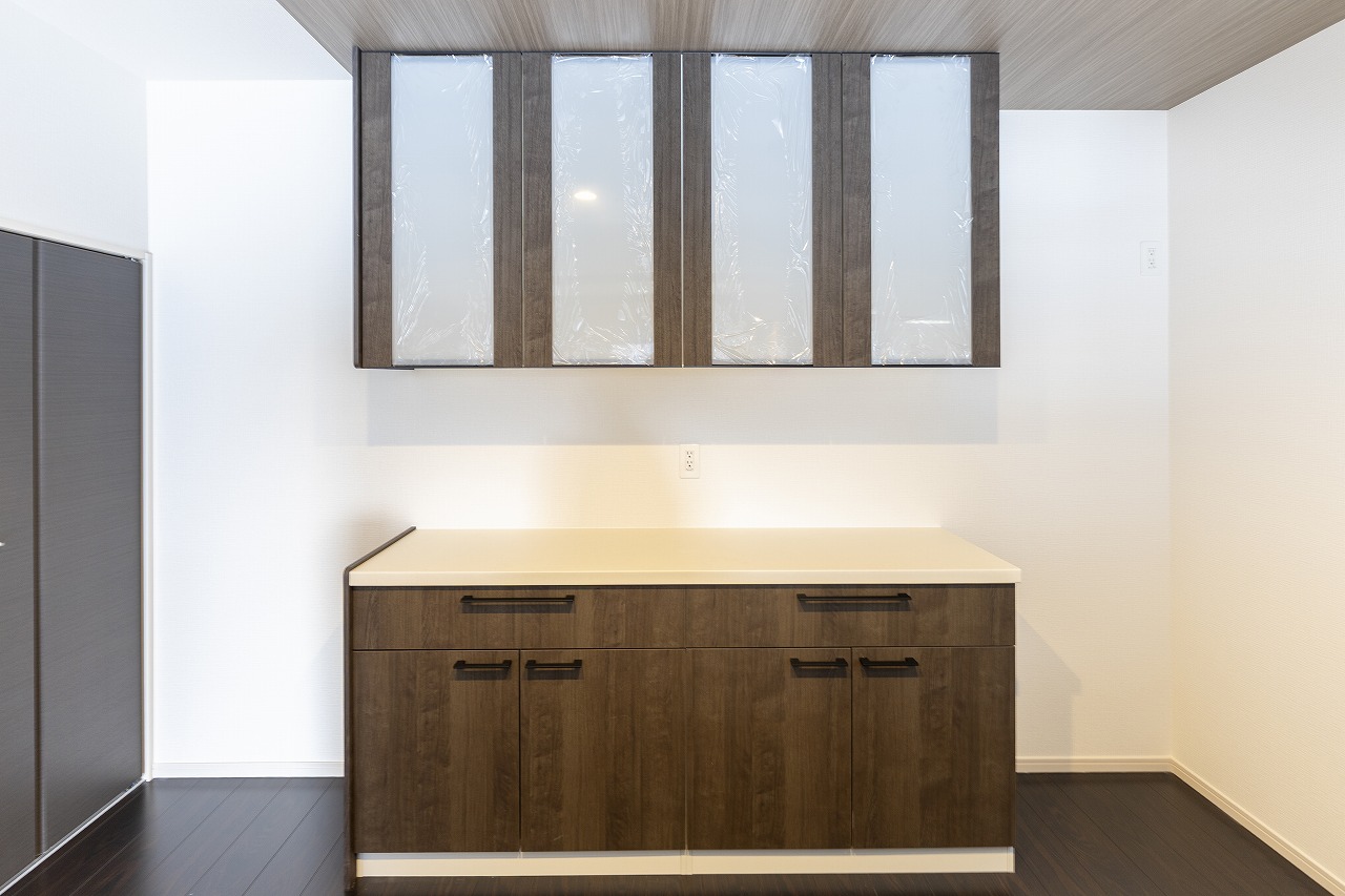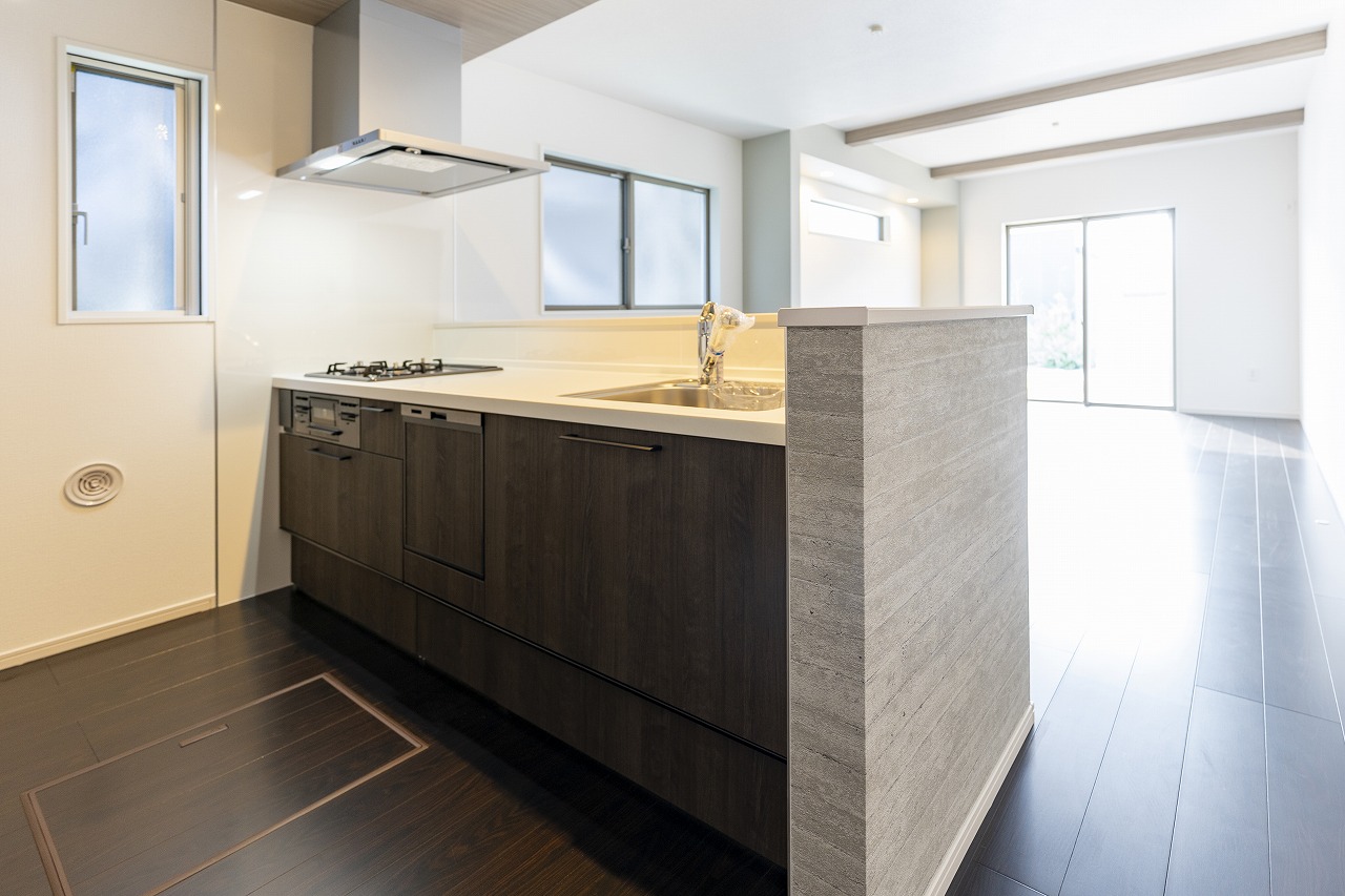 LDK全体を見渡せるペニンシュラ風の対面キッチン。下がり天井のアクセントが、特別なステージのような高揚感を演出します。手元を隠す立ち上がり壁が、急な来客時でも洗い物などの生活感をスマートにカバー。