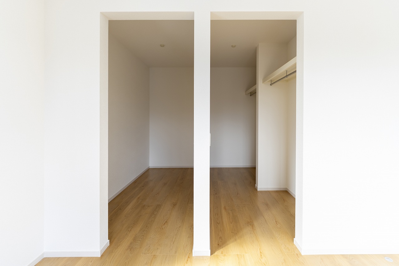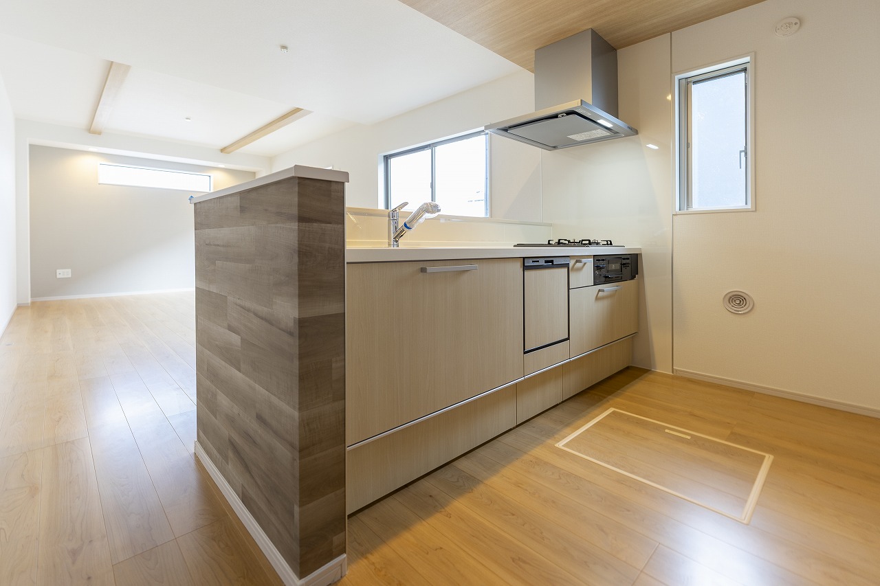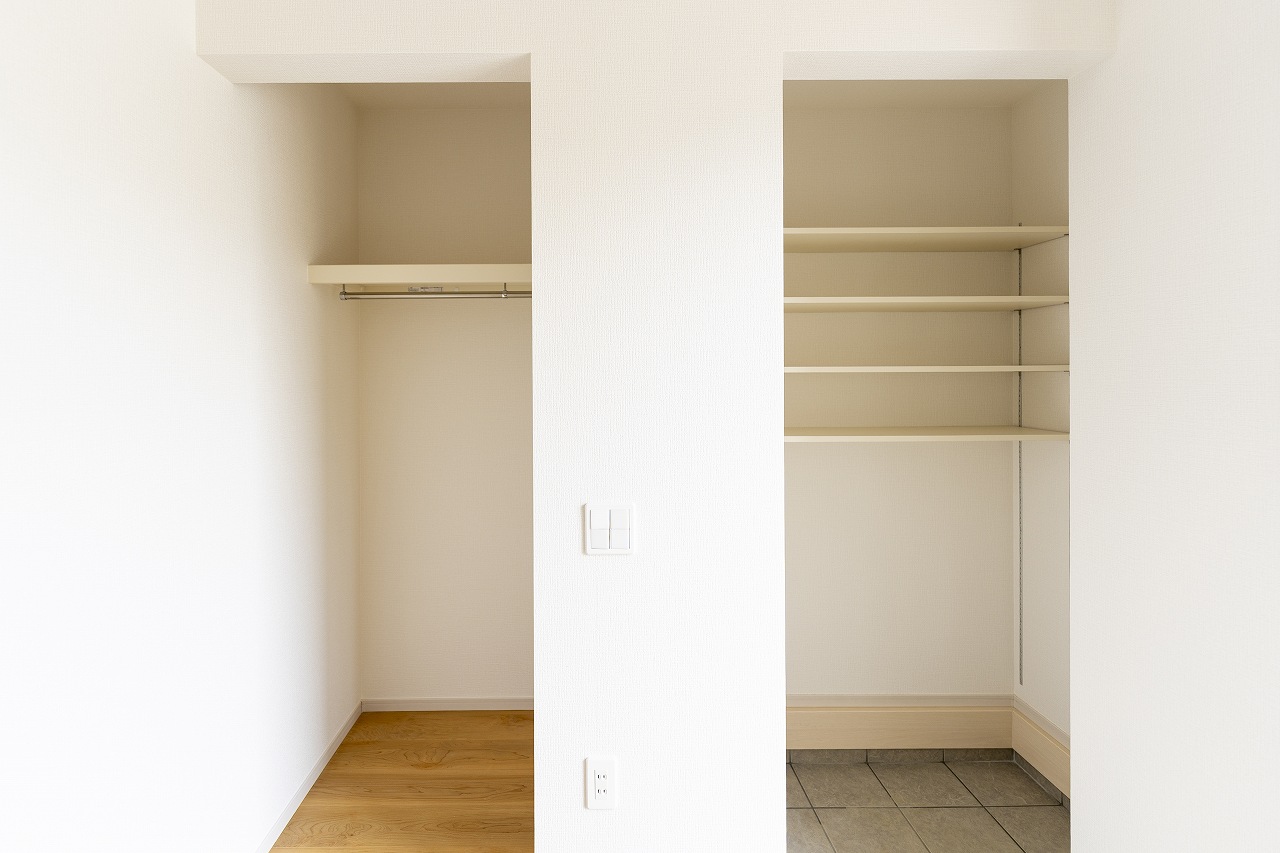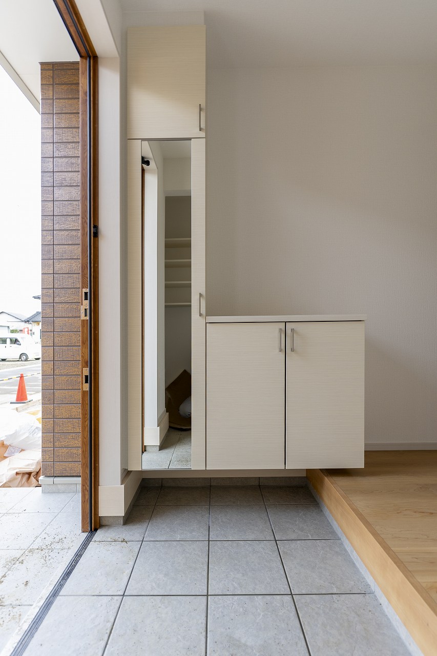 玄関には靴をしまうシューズインクロークに加え、コートや鞄を置けるホールクロークを完備。帰宅してすぐに荷物を片付けられるため、リビングに上着や荷物が散らかるのを防ぎます。キッチン横のパントリーもあり、生活感を隠す工夫が満載です。