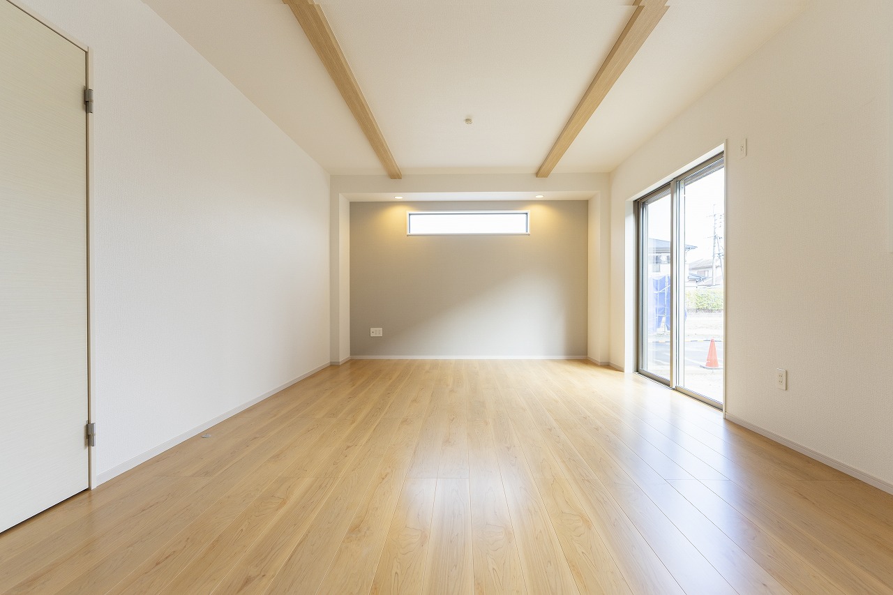 リビングのドアを開けた瞬間、パッと視界が明るくなる心地よさ。 南面の大きな窓からは庭の緑や陽光を、高い位置の窓からは空の明るさを取り込む「3面採光」設計です。 天井を高く折り上げた開放的な空間には、木の温もりを感じる化粧梁がアクセントに。