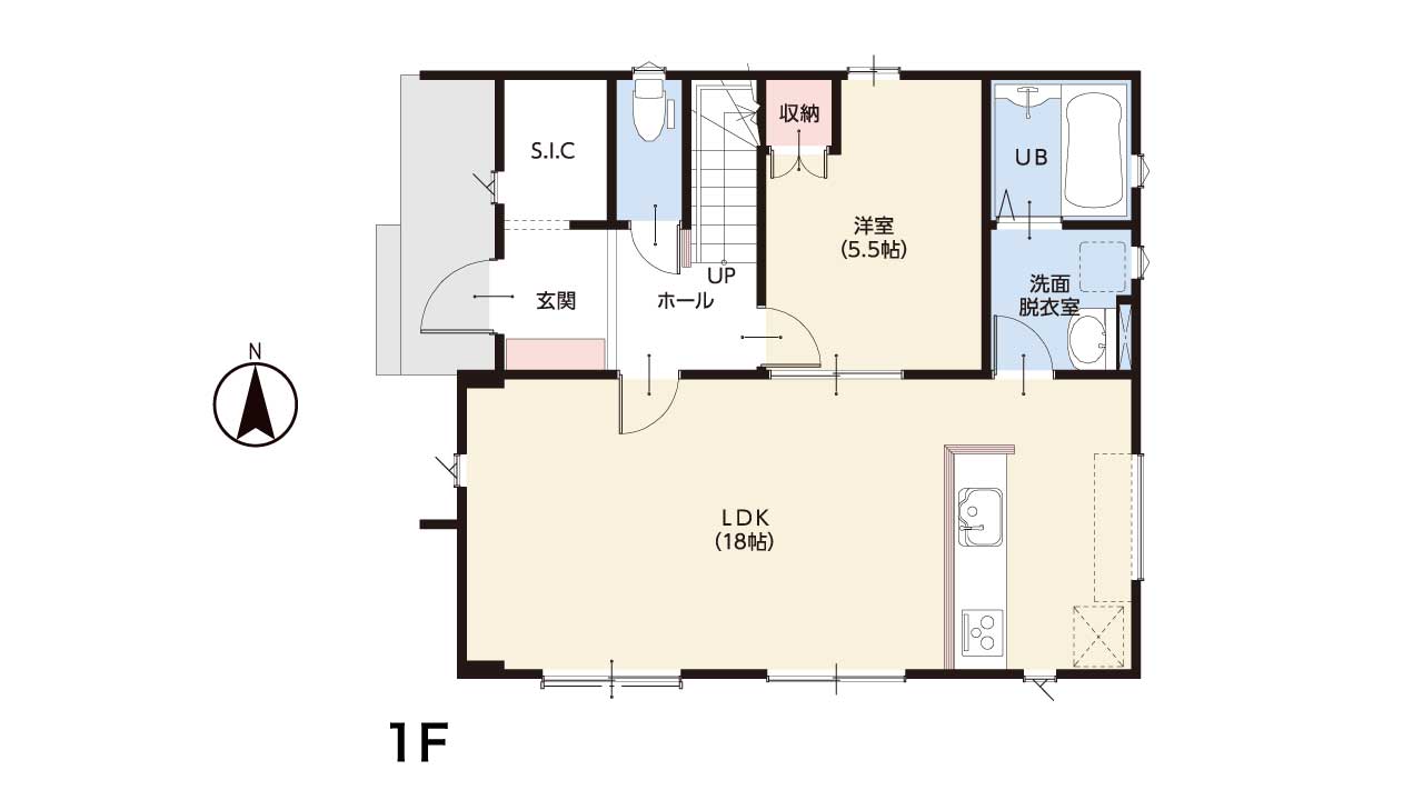 リビングに隣接して配置された5.5帖の洋室は、客間やテレワーク部屋としてはもちろん、将来的には夫婦の寝室としても利用可能。階段を使わずに生活が完結できるため、老後も安心の設計です。玄関のシューズインクロークもしっかり完備し、収納力も確保しています。
