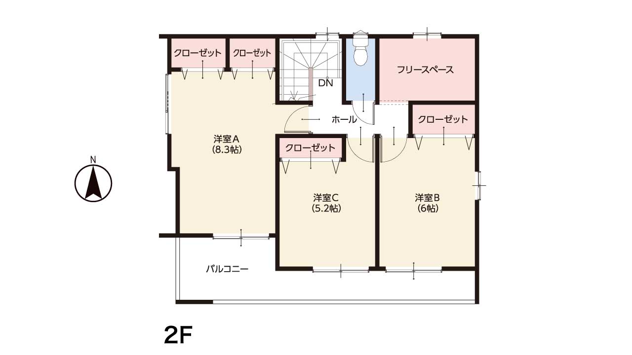 主寝室は広々とした8.3帖を確保し、ゆったりとくつろげます。さらに、階段を上がった先に「フリースペース」を設置。収納家具を置いてファミリーライブラリーにしたり、室内干しスペースにしたりと、家族の成長に合わせて自由にカスタマイズできます。