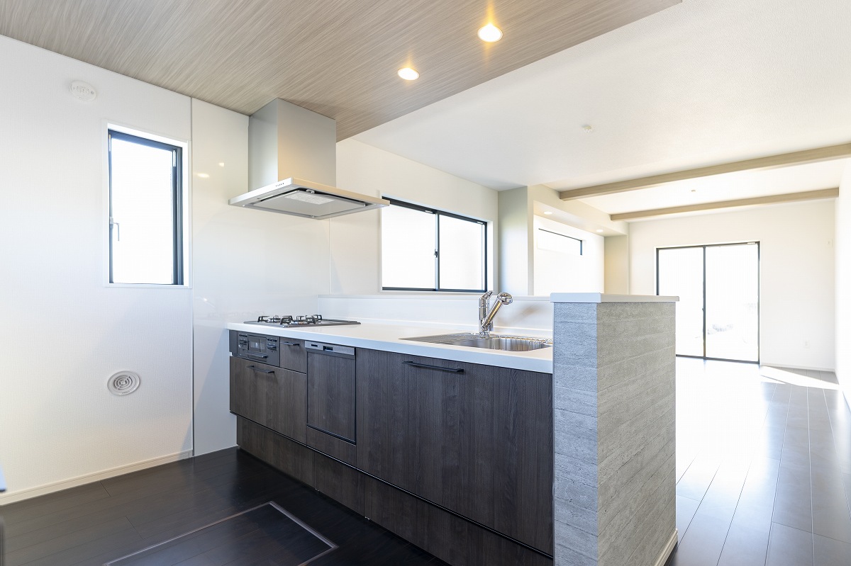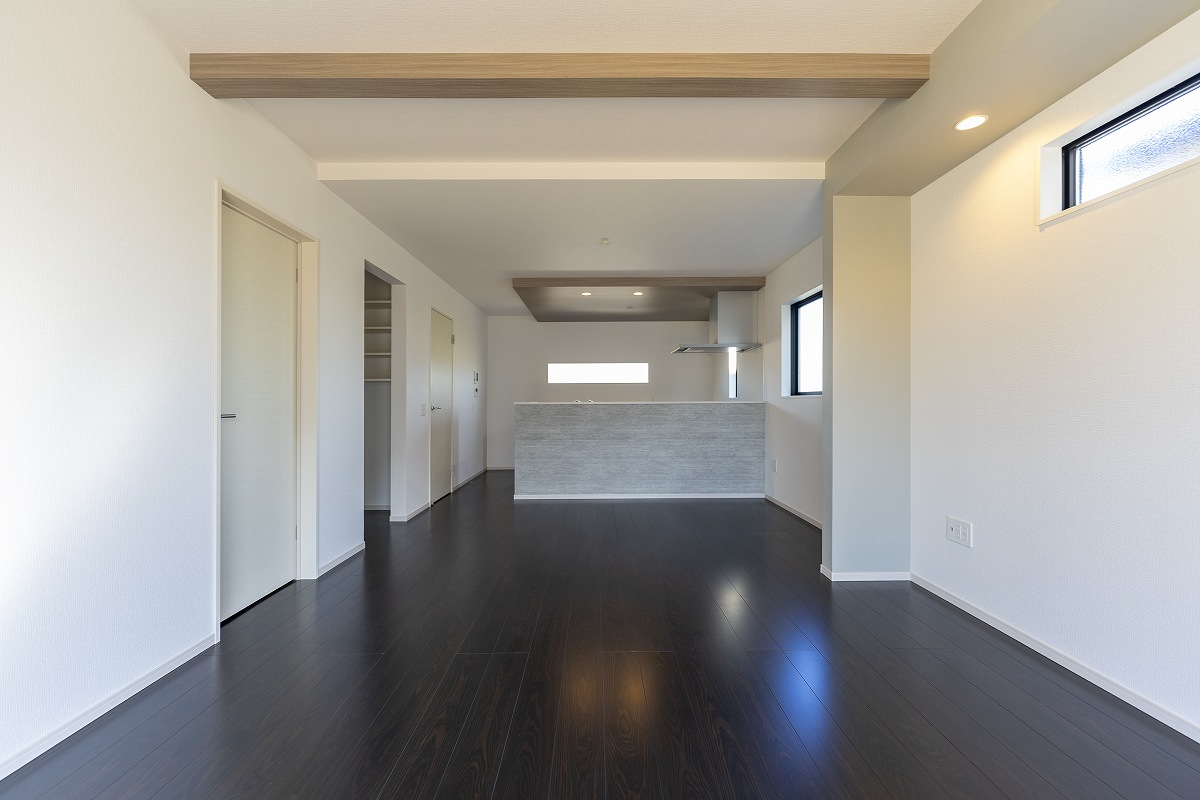 足元には重厚感のあるダークブラウンの無垢調フローリング。そして見上げれば、空間にリズムを生む「化粧梁」と、キッチンを優しく包み込む「木目調の下がり天井」が広がります。18帖という広々とした空間を壁で区切るのではなく、天井のデザインを変えることで、開放感を保ちながら「リビング」と「ダイニングキッチン」の役割を美しくゾーニングしています。