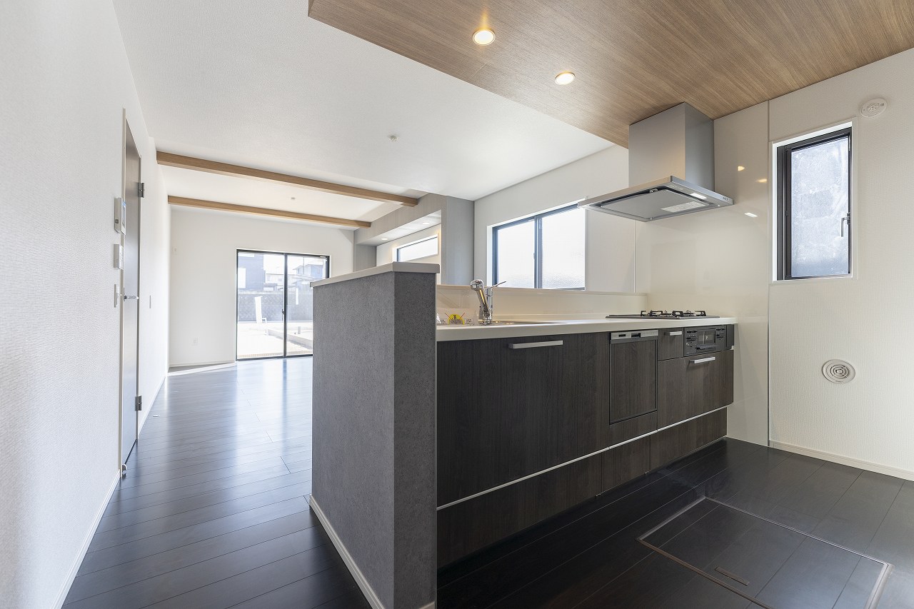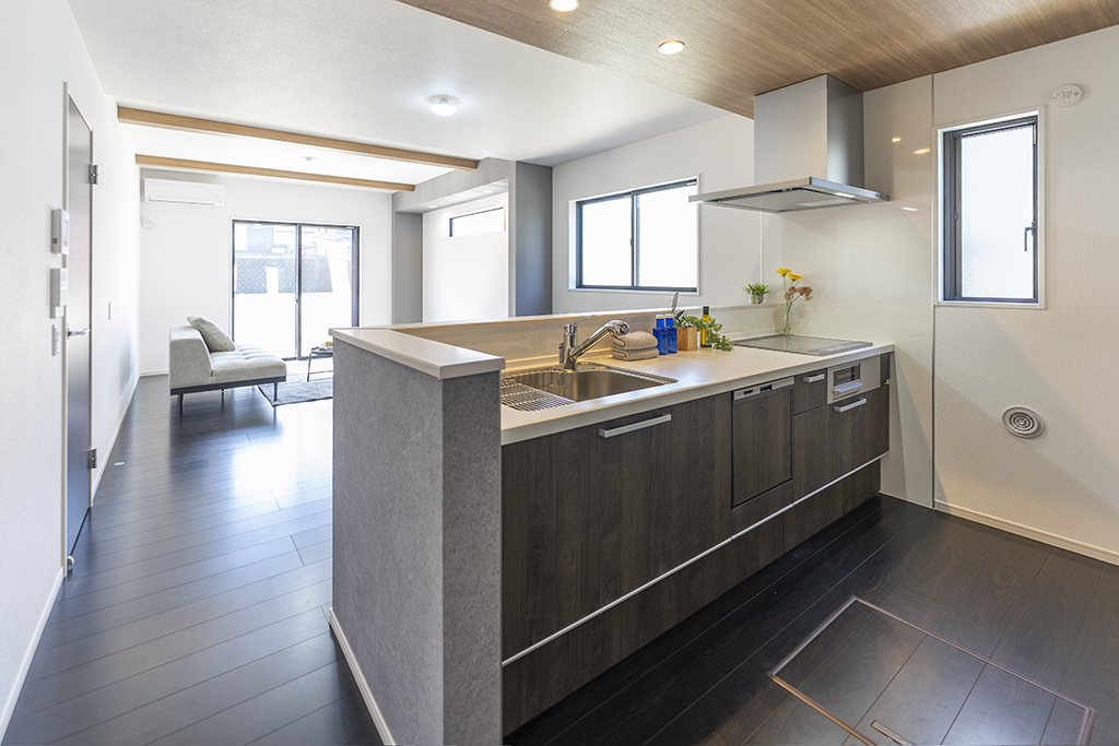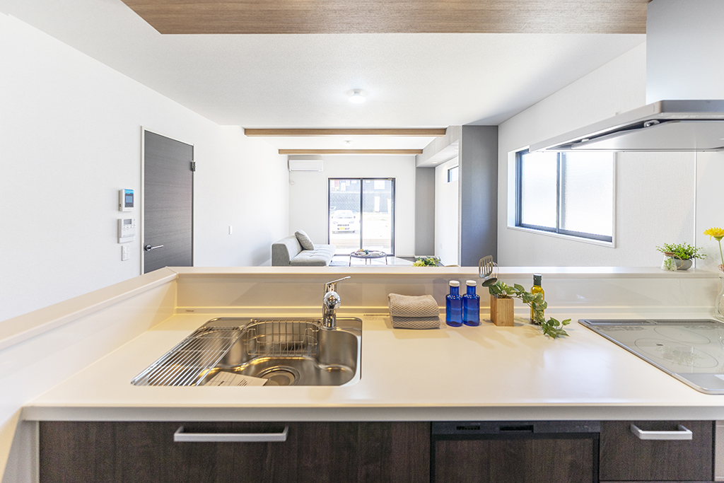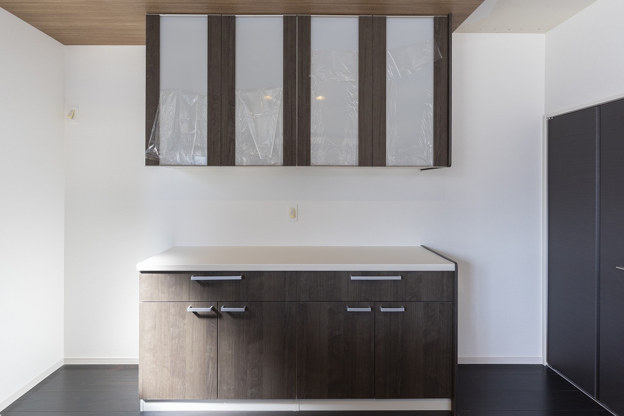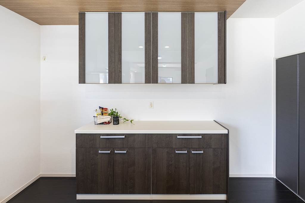 キッチンと完璧にデザインを統一した、ワイドサイズの背面収納。炊飯器やコーヒーメーカーなどの調理家電を美しく並べられる広いカウンターは、盛り付け時のサブテーブルとしても大活躍します。