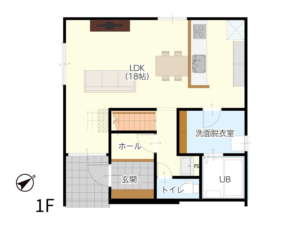 キッチンから水回りへ直接アクセスできる便利な家事動線に加え、トイレをリビングから離れた玄関横に配置することで来客時も気兼ねなく使える設計