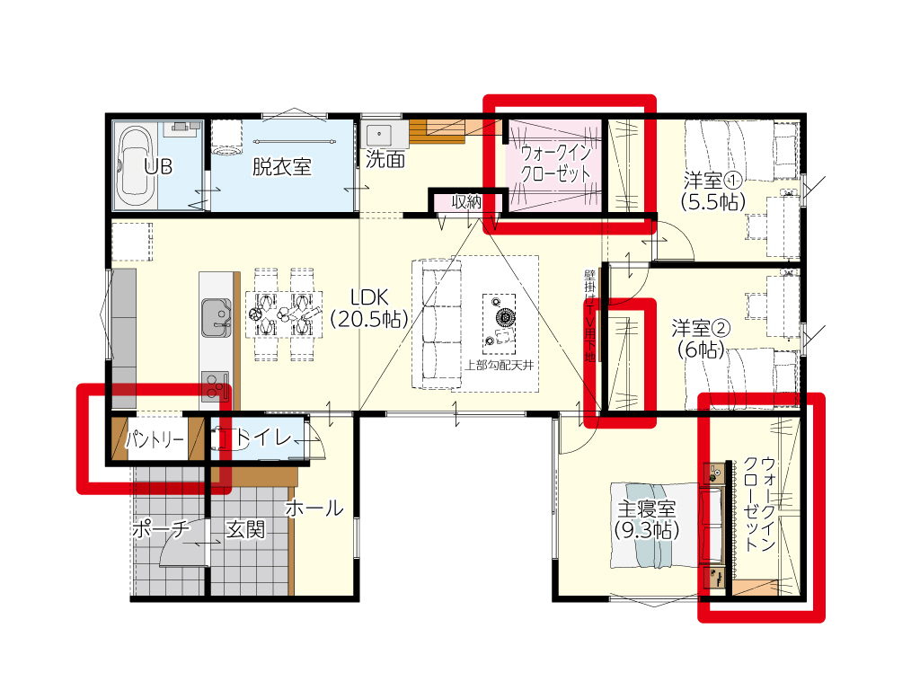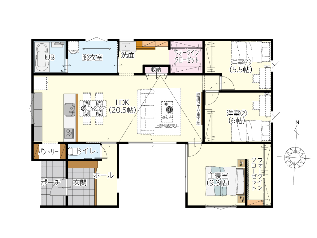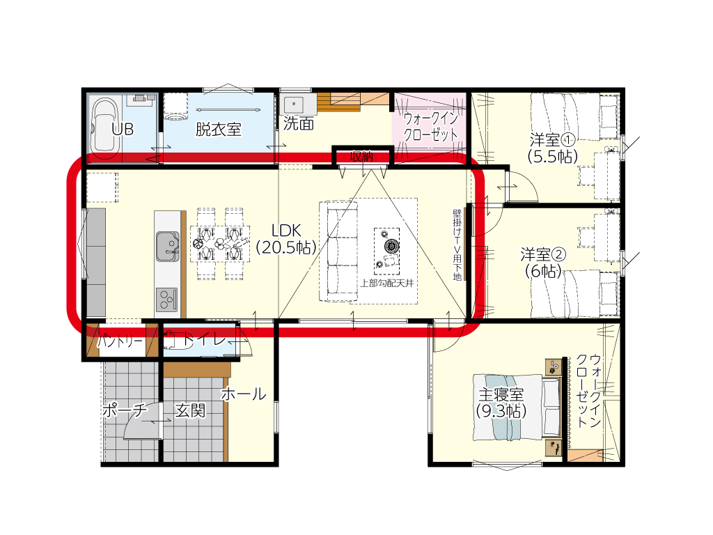 リビング上部を勾配天井にすることで、縦方向への広がりを演出しました。20.5帖の広々としたLDKは、家族がどこにいても気配を感じられる家の中心。壁掛けTV用の下地も施工済みで、インテリアを邪魔しないスッキリとした空間づくりが可能です。