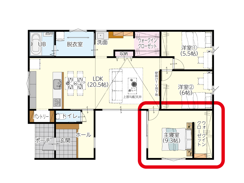 リビングから少し離れた位置に配した主寝室は、平屋でありながらプライバシーをしっかり確保。大型のウォークインクローゼットを併設し、夫婦の衣類や季節物も一箇所に集約。朝の着替えから就寝まで、スムーズなリズムを作ります。