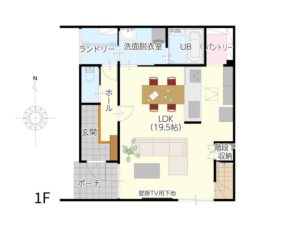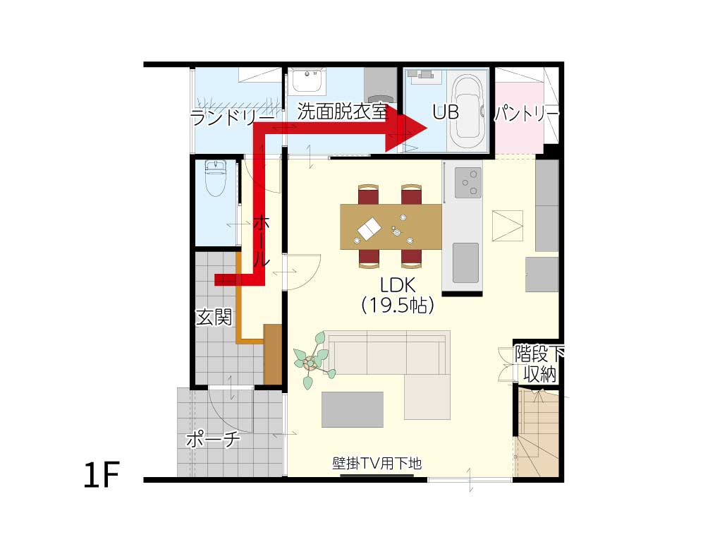 玄関ホールから「ランドリー」を通って「洗面脱衣室」へ、そして「LDK」へと通り抜けられるウォークスルー動線。