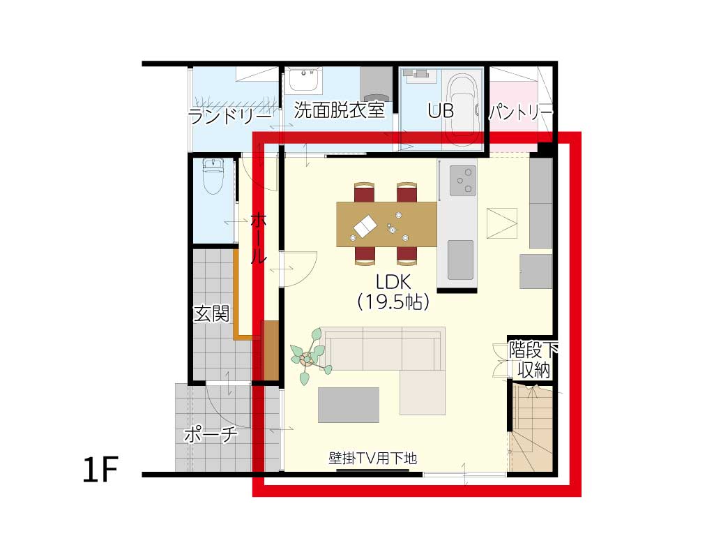 賃貸ではまず無い、19.5帖もの広々としたLDK。壁掛けテレビも設置可能で、さらにスッキリとした空間に。