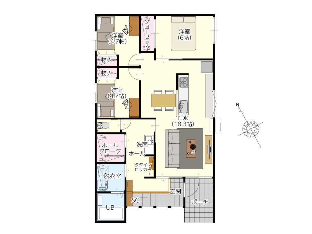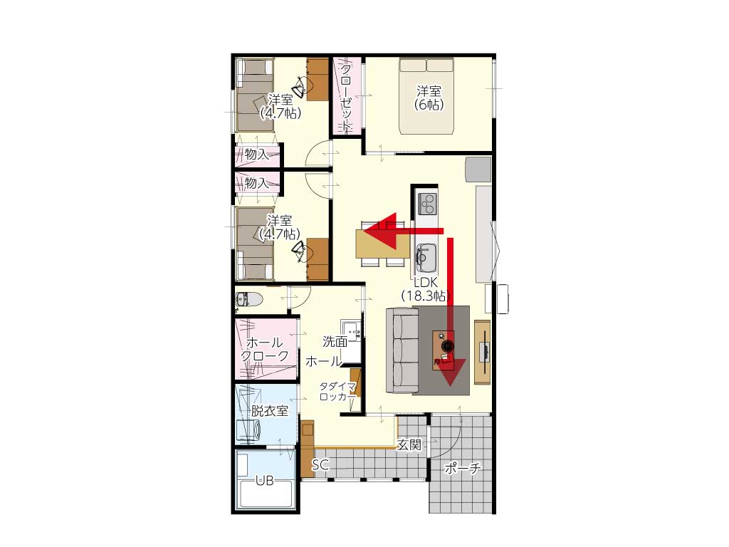 キッチンで料理をしていても、リビングで遊ぶお子様に目が届きます。「ママ!見て!」に応えやすく、廊下がないため家族の気配を常に感じられる安心感は平屋ならではです。