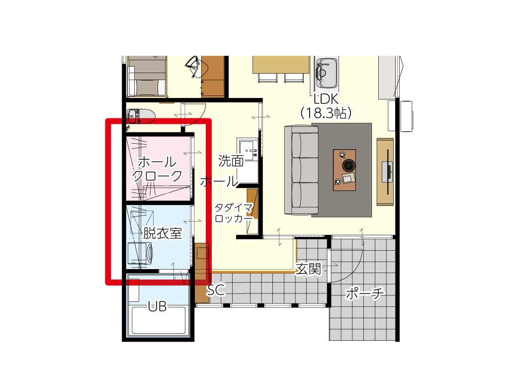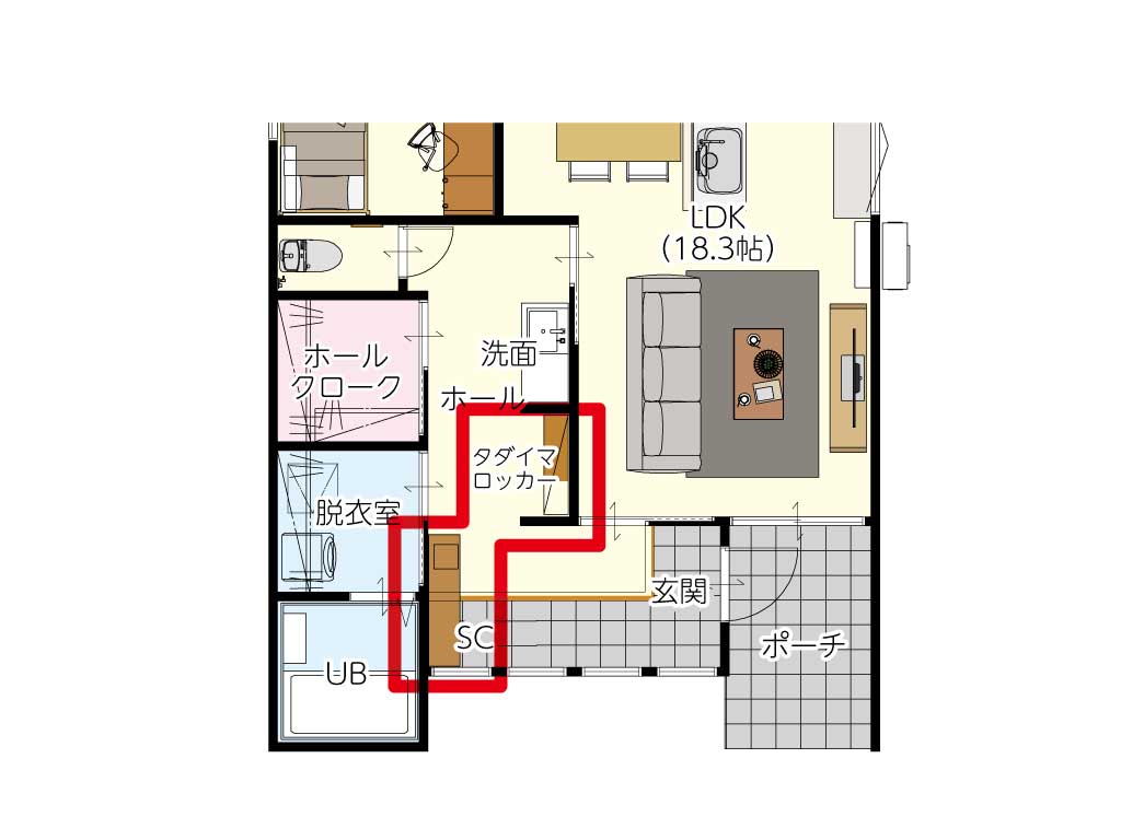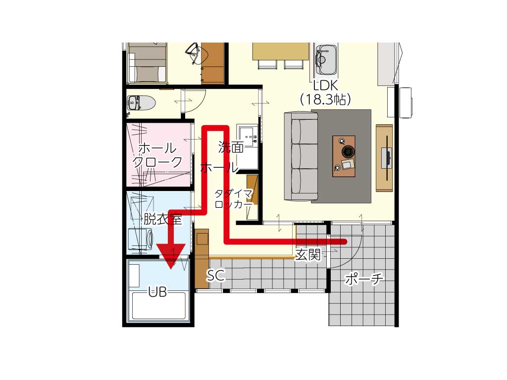 外遊びで泥だらけになったお子様を、リビングを汚さずそのまま洗面・浴室へ直行させられます。インフルエンザ等の感染症対策(帰宅後すぐの手洗い)も自然と習慣化します。
