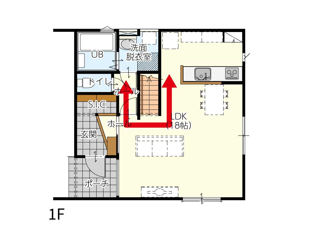 キッチンからリビング全体が見渡せる安心感と、水回りを集約した効率的な家事動線。育児と家事の両立をサポートし、忙しい毎日に「時間」と「心のゆとり」を生み出します。