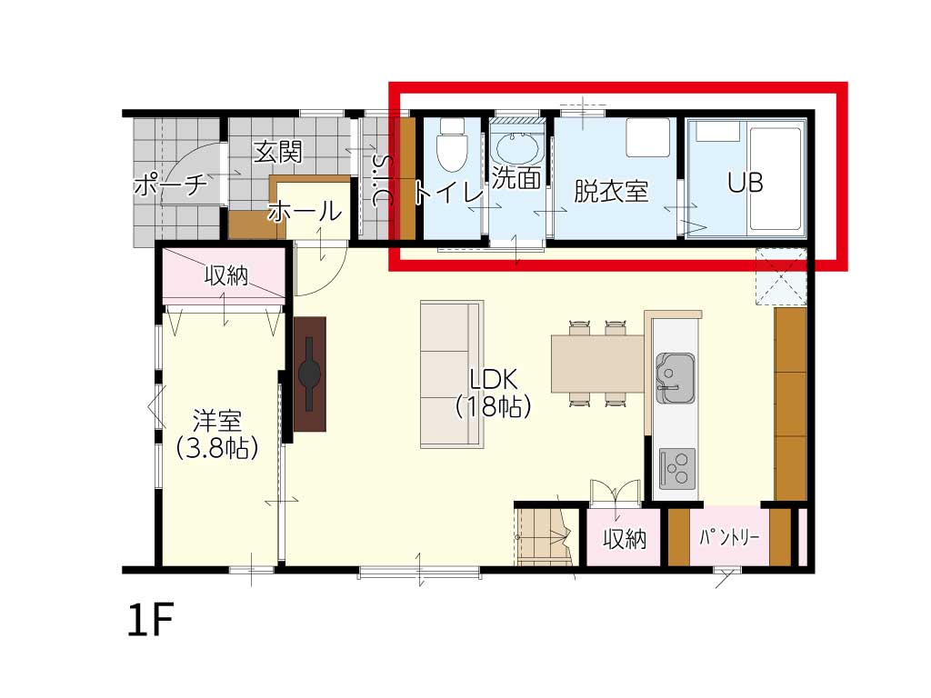 洗面と脱衣所を分けた設計は、子育て世帯の隠れた悩み「入浴中の洗面台使えない問題」を解決します。来客時も脱衣所の生活感を隠せるため、自信を持って人を招ける住まいです。