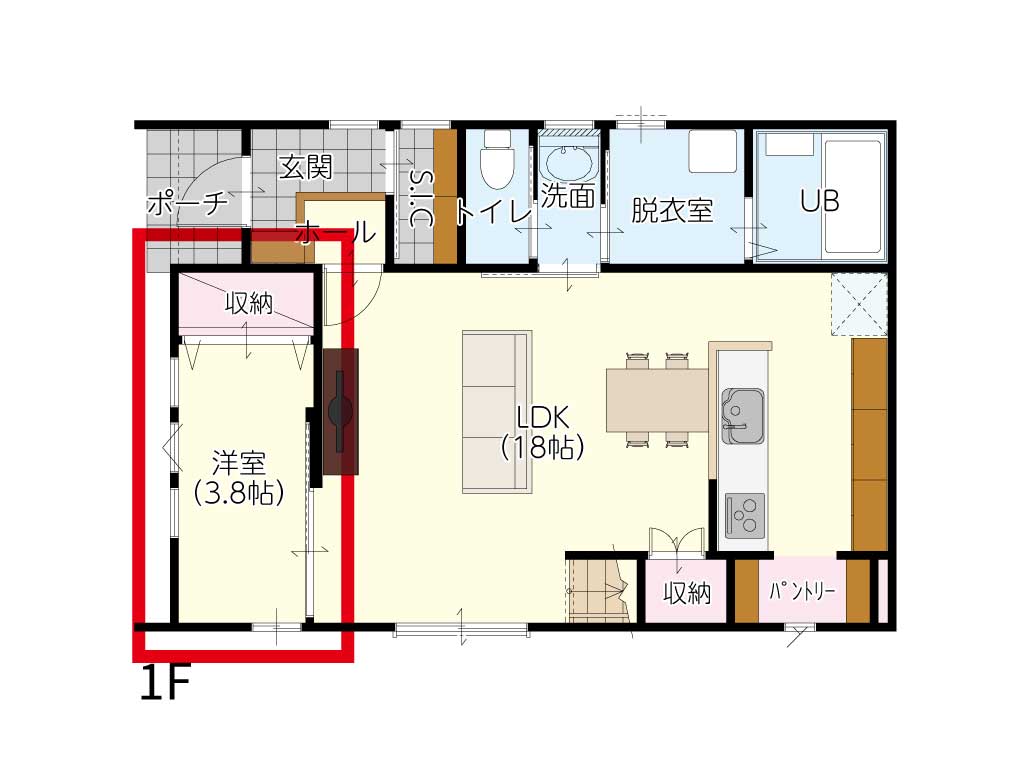 3.8帖の洋室は、扉を開ければリビングの一部として、閉めれば独立した個室として機能。お子様の成長に合わせて「ベビースペース→学習室→書斎」と、住む人が自由に用途を決められる可変性が魅力です。