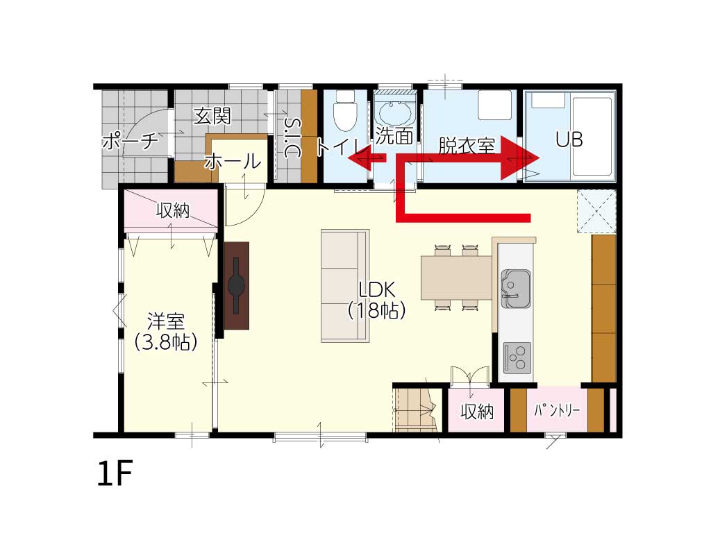 キッチンを中心に、水回り、パントリー、リビング収納へアクセスしやすい「家事集中動線」。無駄な動きを省く設計が、忙しい子育てママ・パパの心にゆとりをもたらします。