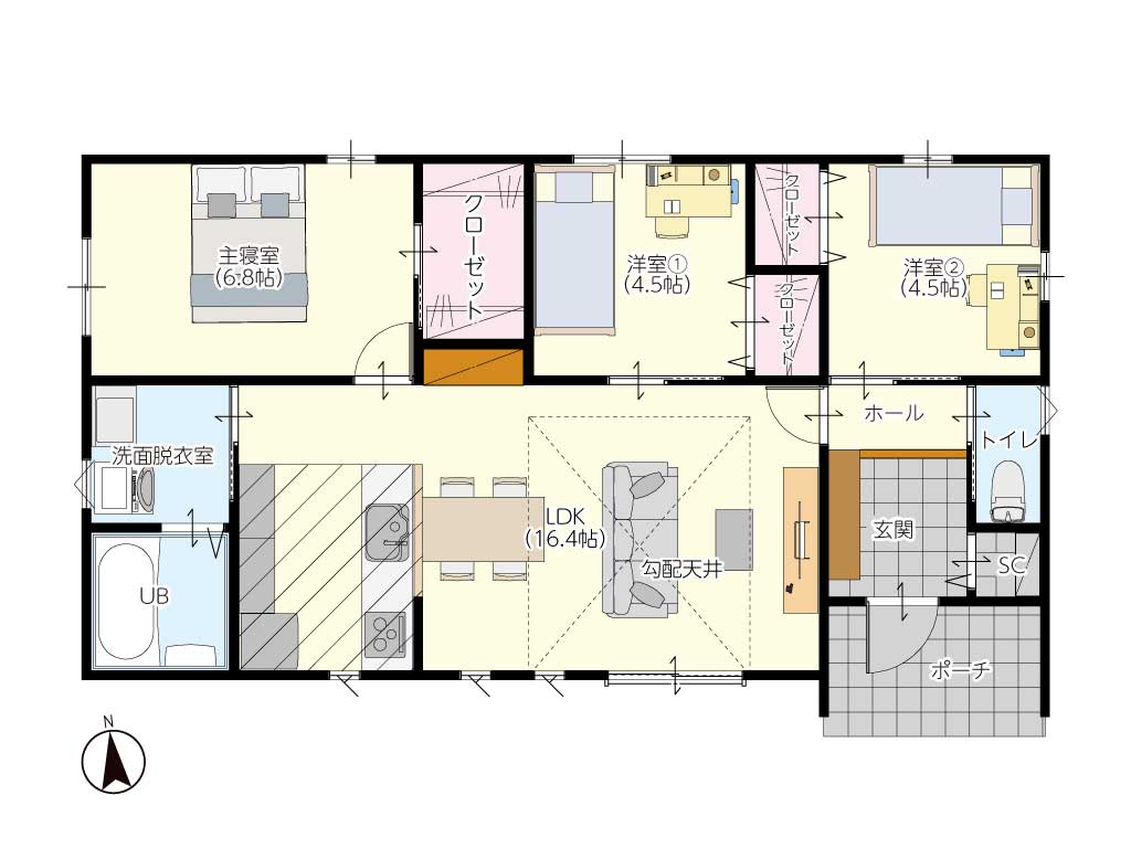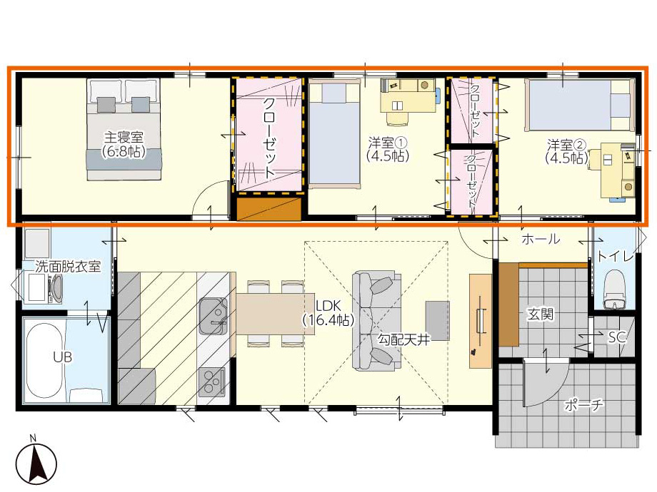 家族が集まる明るい南側のLDKに対し、静かに過ごしたい寝室や子ども部屋は北側と西側に配置。さらに、部屋と部屋の間にクローゼットを挟み込むことで、生活音を優しく遮断します。リビングからの楽しそうな笑い声は程よく届きつつも、自分の部屋では勉強や読書にしっかり集中できる。