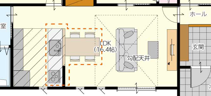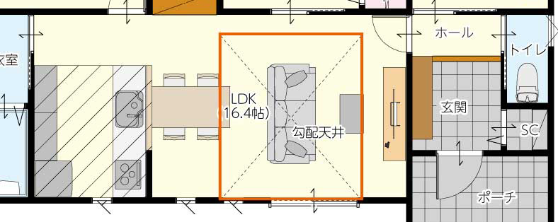 玄関を抜けた先に広がるのは、想像を超える開放感。屋根の形状を活かした勾配天井が、平屋でありながら圧倒的な縦の広がりを生み出します。南側の大きな窓から差し込む陽光は、部屋全体を優しく包み込みます。