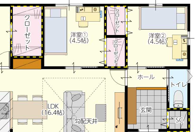 美しい空間を保つ秘訣は、使う場所のすぐ近くに収納があること。玄関を開けてすぐのシューズクローク(SC)には、ベビーカーやアウトドア用品まで収納可能。泥んこの靴もリビングに持ち込ませません。各居室にも大容量のクローゼットを完備し、家具を買い足す必要がないため、地震時の安全性も高まり、広々とした空間をそのまま維持できます。