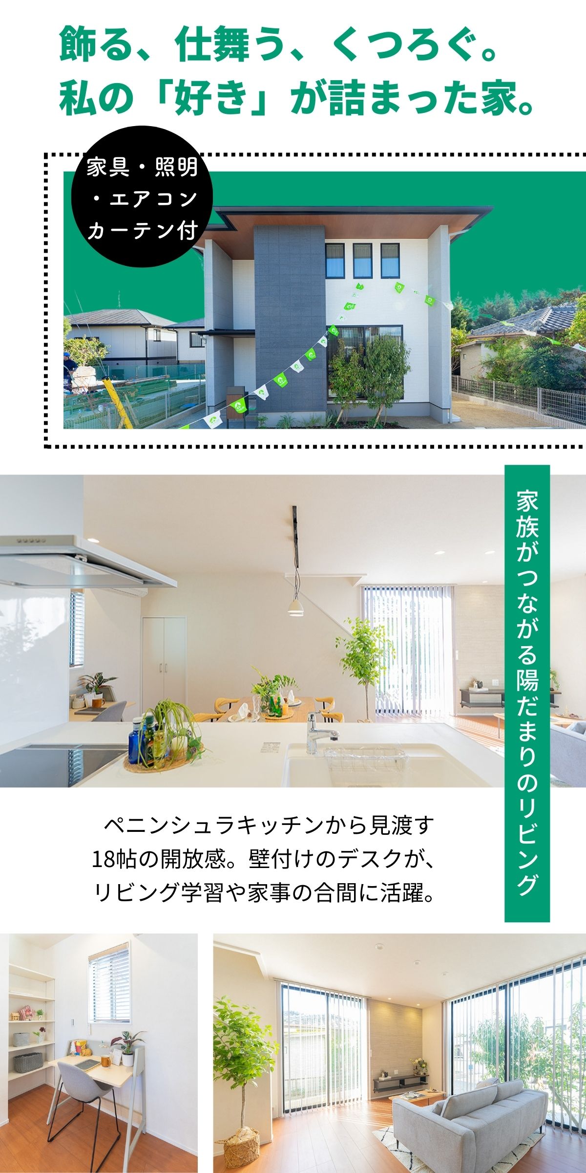 陽光がたっぷりと注ぐ明るいリビングは、観葉植物の緑がよく映えます。家族みんなでソファに腰掛け、移ろう光の中で過ごす休日は、何気ない日常を特別な時間に変えてくれます。日々の会話が自然と増える工夫です。