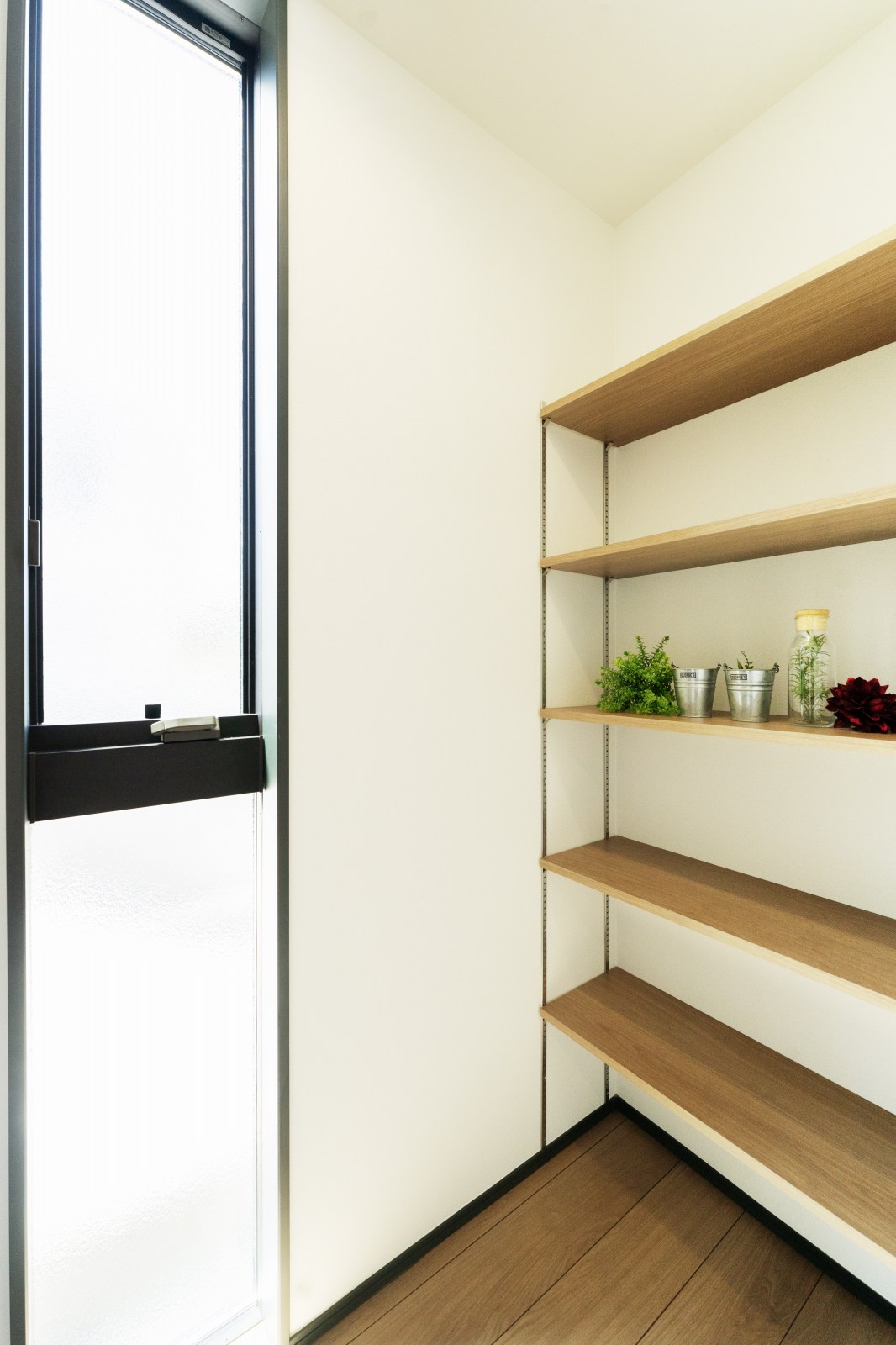 窓から光が差し込む明るいキッチン。奥側は買い置きの品を収納できるパントリーになっています。