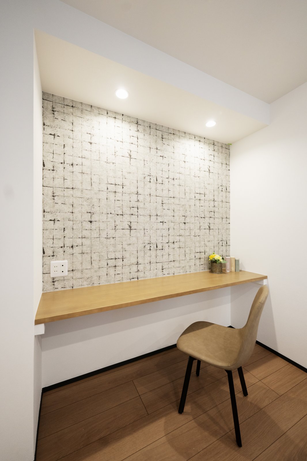 壁に向かう配置は視覚的な情報が遮断されるため、家族と同じ空間にいても驚くほど作業に集中できます。テレワークやPC作業、家計簿の記入など、ちょっとした書き物をするのに最適。