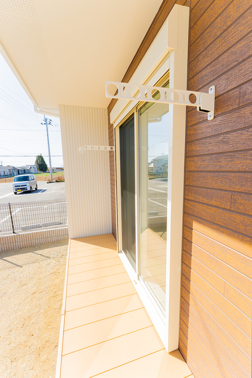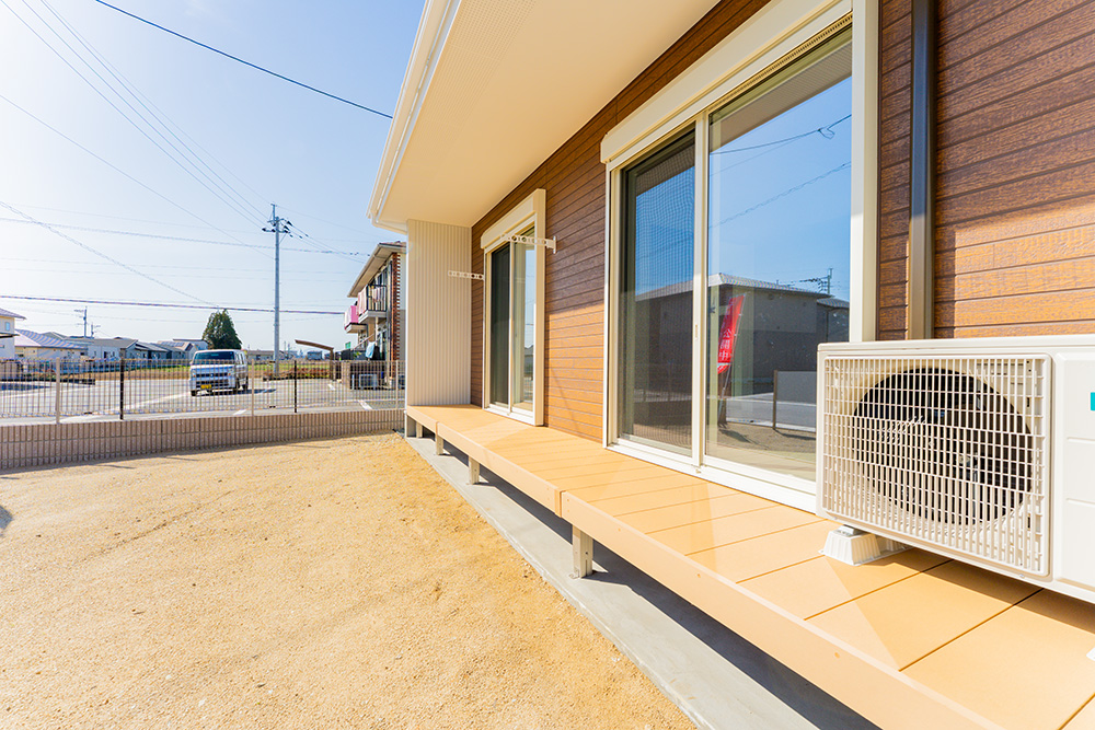 南面に広がるウッドデッキは、日常をリゾートに変える開放感と、究極の実用性を兼ね備えています。深い軒(のき)が強い日差しや急な通り雨をガード。備え付けの物干し設備により、「外干し」が可能。LDKや和室から段差なく出入りできるため、重い洗濯物を持っての移動もスムーズ。