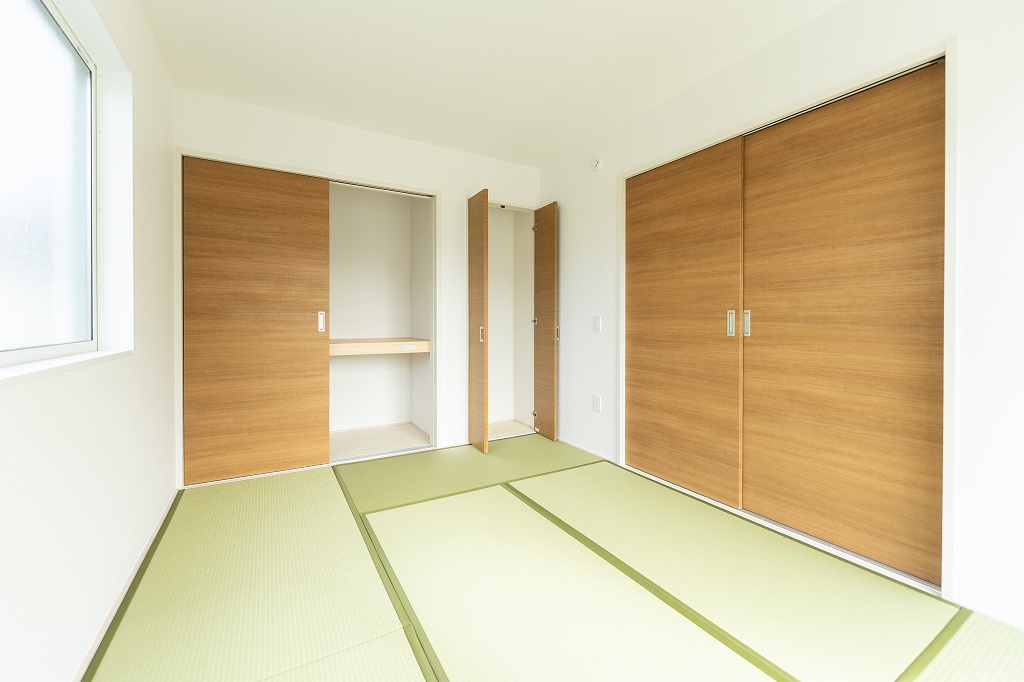 木目調の引き戸を採用し、LDKと地続きのように馴染むモダンな和室です。扉を開け放てば22帖超の大空間へ。お子様のお昼寝、ちょっとした家事、ゲストルームなど、その日の暮らしに合わせて柔軟に姿を変える心地よい空間です。