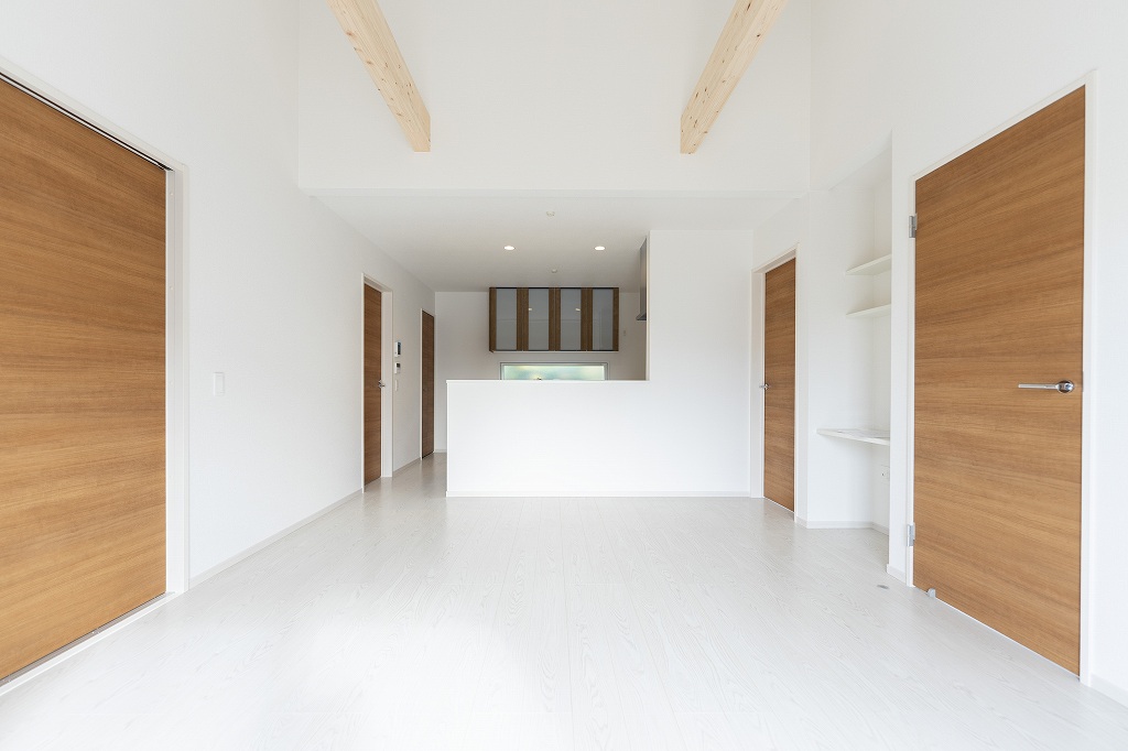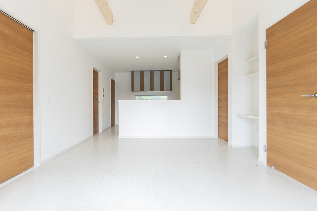 LDKの扉を開けた瞬間、思わず深呼吸したくなるような空間が広がります。屋根の形状をそのまま活かした高い「勾配天井」が、16.2帖の空間に垂直方向の劇的な広がりをもたらしました。空間のアクセントとして架けられた美しい無垢の「現し梁」が、真っ白なキャンバスに木の温もりをプラス。