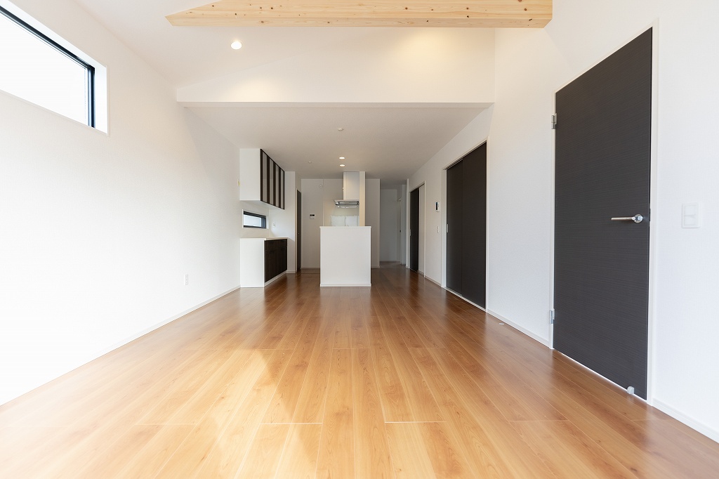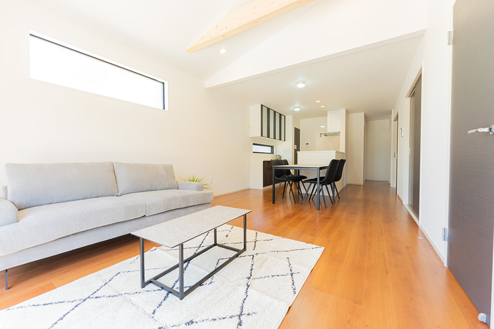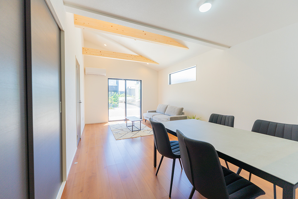 LDKに一歩足を踏み入れると、そこには勾配天井が生み出す大空間が広がります。天井を走る力強い化粧梁は、木の温もりを伝え、住まいに安心感をプラス。平屋でありながら、吹き抜けがあるかのような縦への広がりが、心からのリラックスを叶えます。