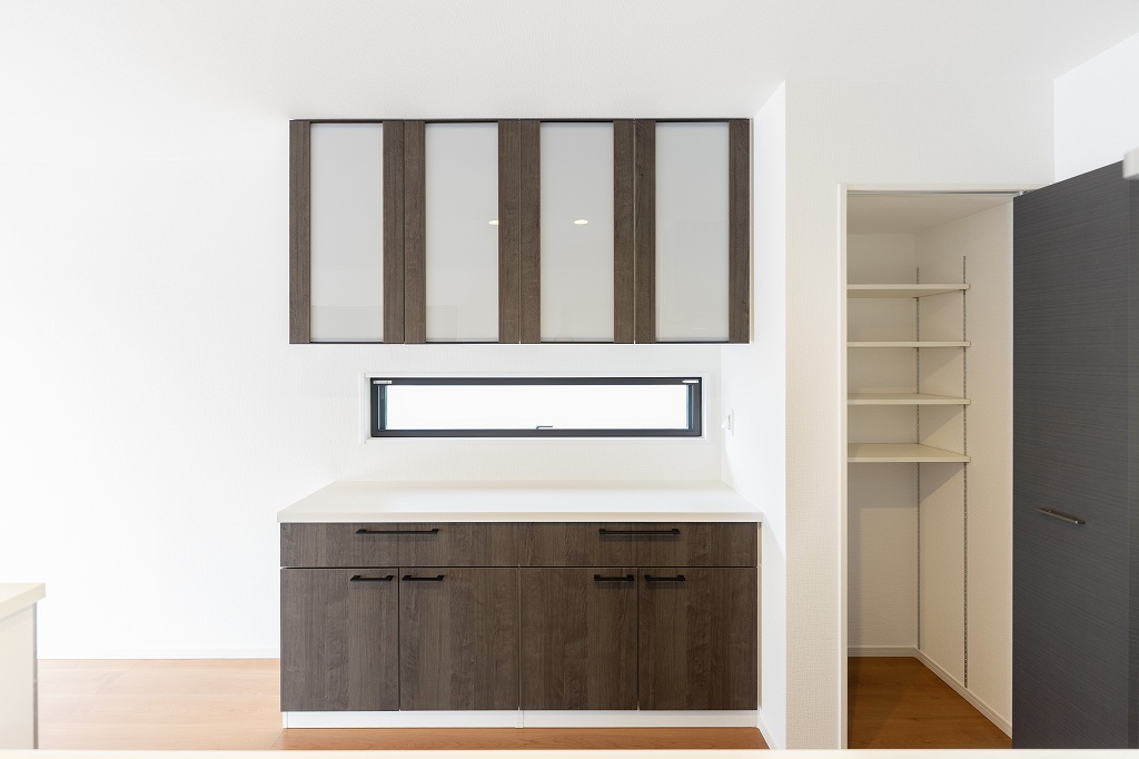 キッチン背面のカップボードは、まるでオーダー家具のような佇まい。隣接する可動棚付きのパントリー(大容量収納)が生活感を隠してくれるから、キッチン周りは常にモデルハウスのような美しさをキープできます。