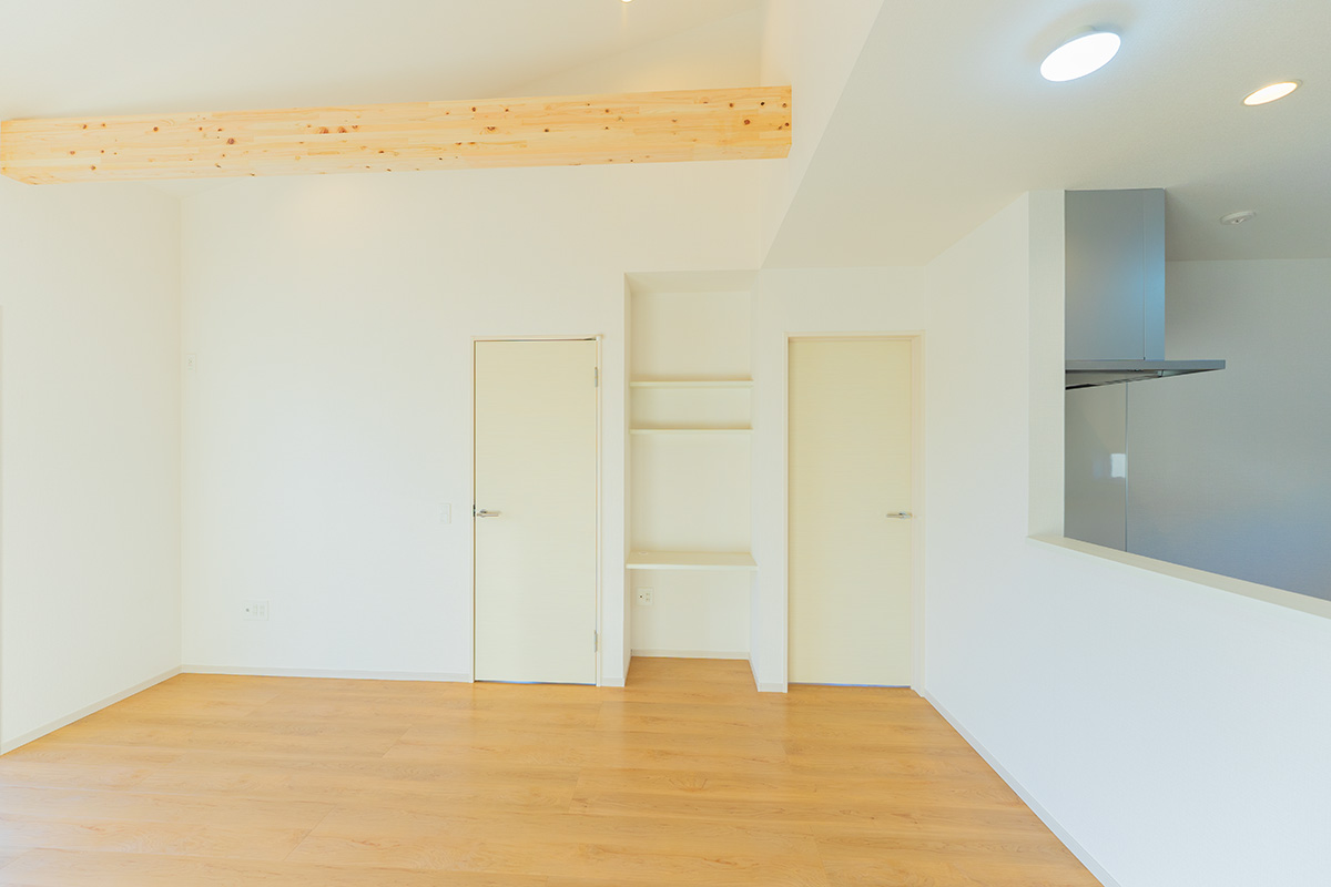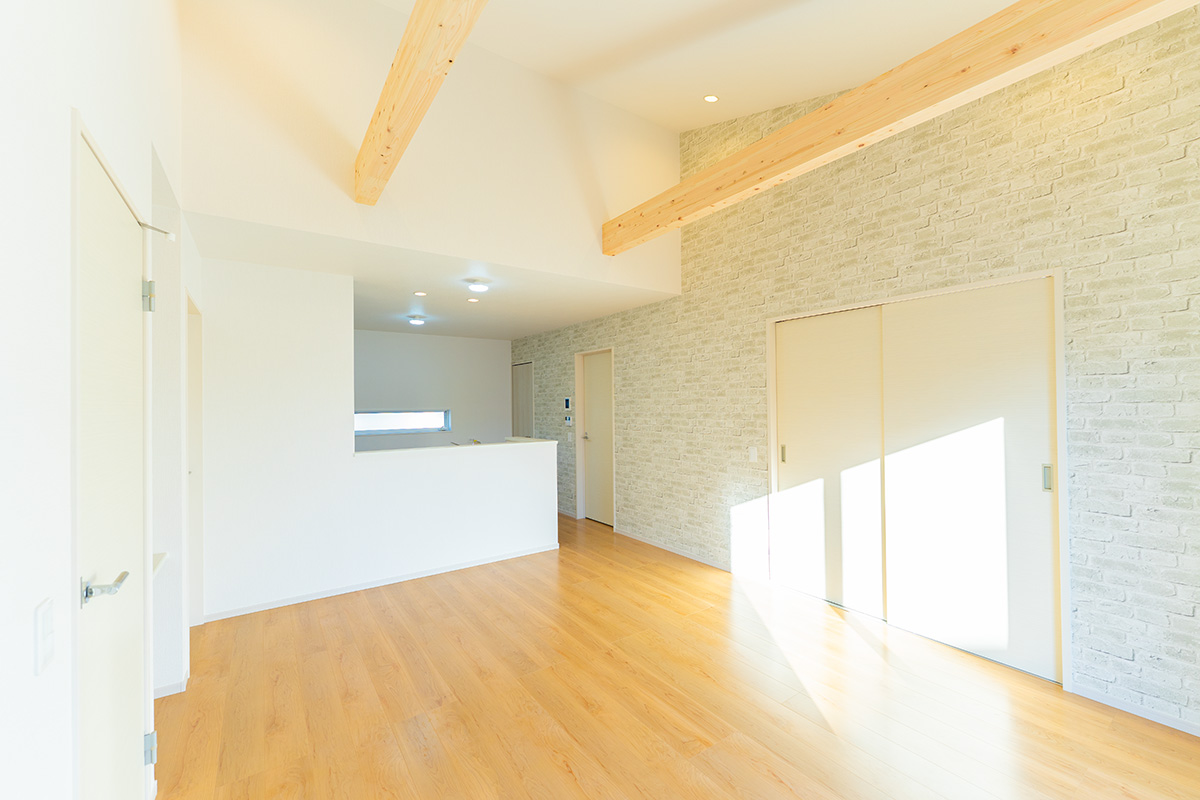 リビングの扉を開けた瞬間、見上げるほど高く伸びた勾配天井に息を呑むはずです。美しい木目の「現し梁」がアクセントとなり、空間にリズミカルな奥行きを生み出しています。16.2帖という広さ以上の「立体的なゆとり」が、日々の暮らしに極上のリラックスをもたらします。