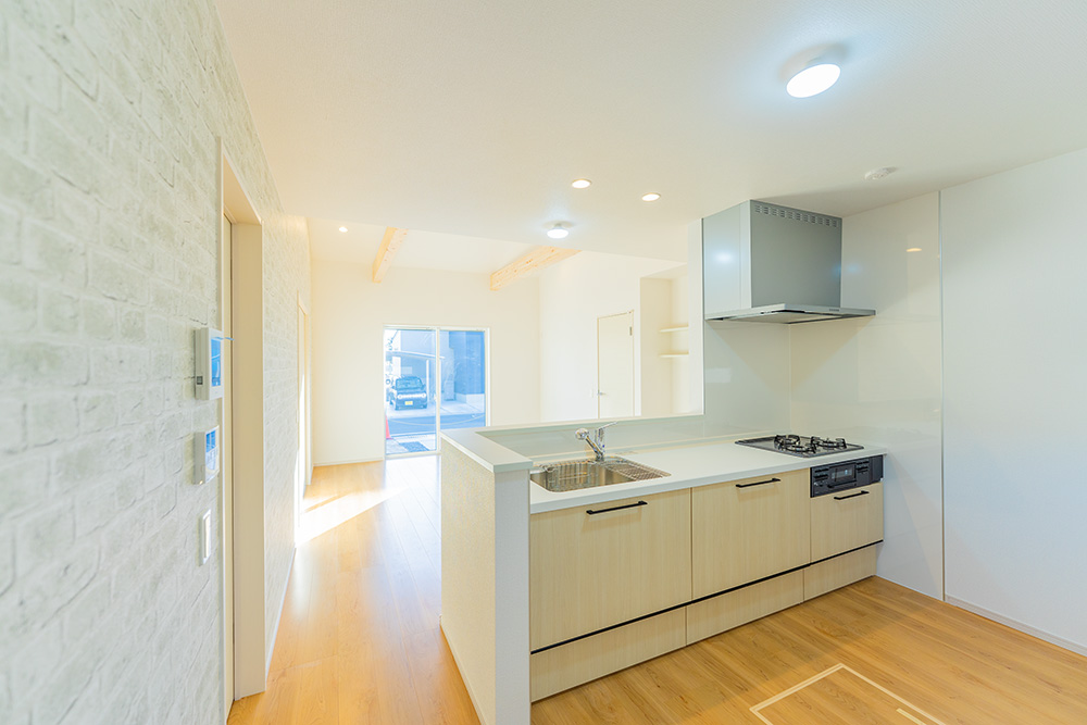 フラットで美しい木目調のオープンキッチンは、単なる調理場ではなく「家族の司令塔」です。シンクの前に立てば、開放的なリビングでくつろぐ家族の笑顔も、高い天井の広がりも、窓の向こうの景色もすべてが視界に収まります。リビングと完全に連続した空間設計により、料理の時間すらも孤立せず、家族との豊かな共有時間へと変わります