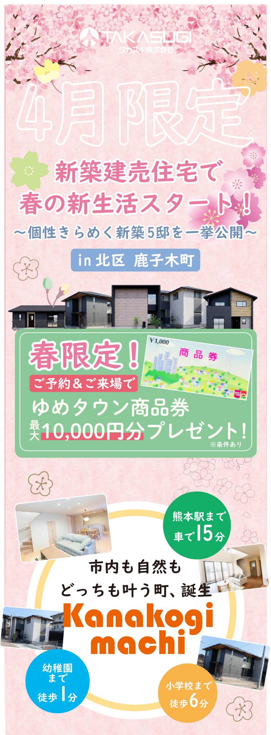【北区 鹿子木町】”4月限定” 春の新築建売住宅5棟発見会!小学校まで徒歩6分の好立地!