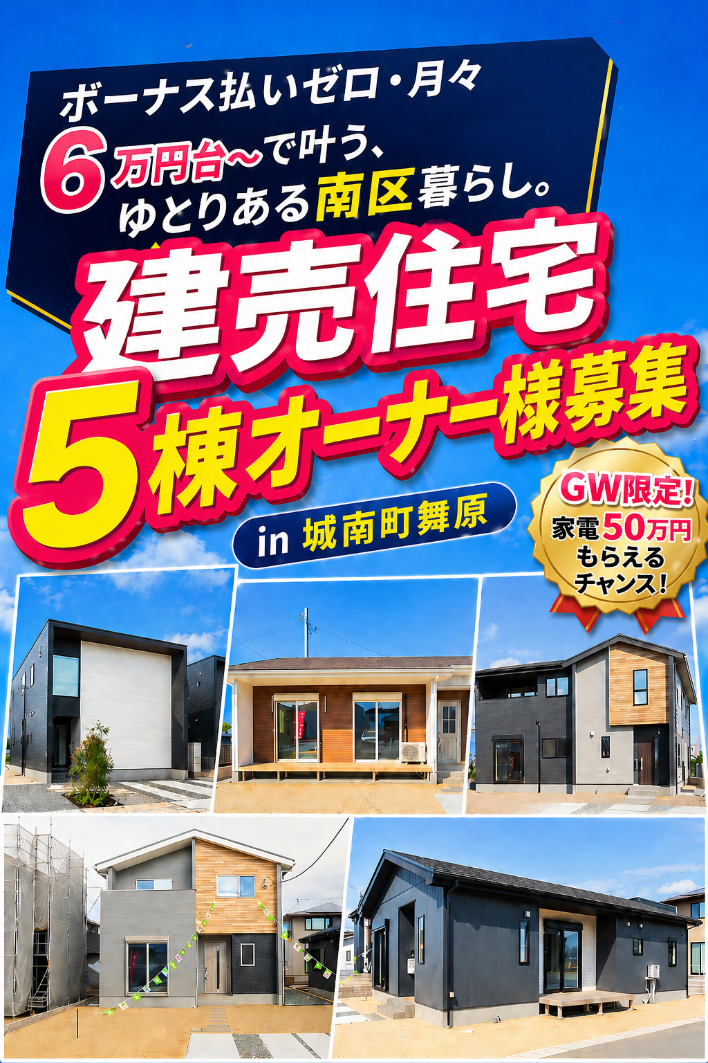 GW限定!【新生活家電プレゼントフェア】城南町舞原の建売住宅をご成約で、最大50万円分の家電をプレゼント!